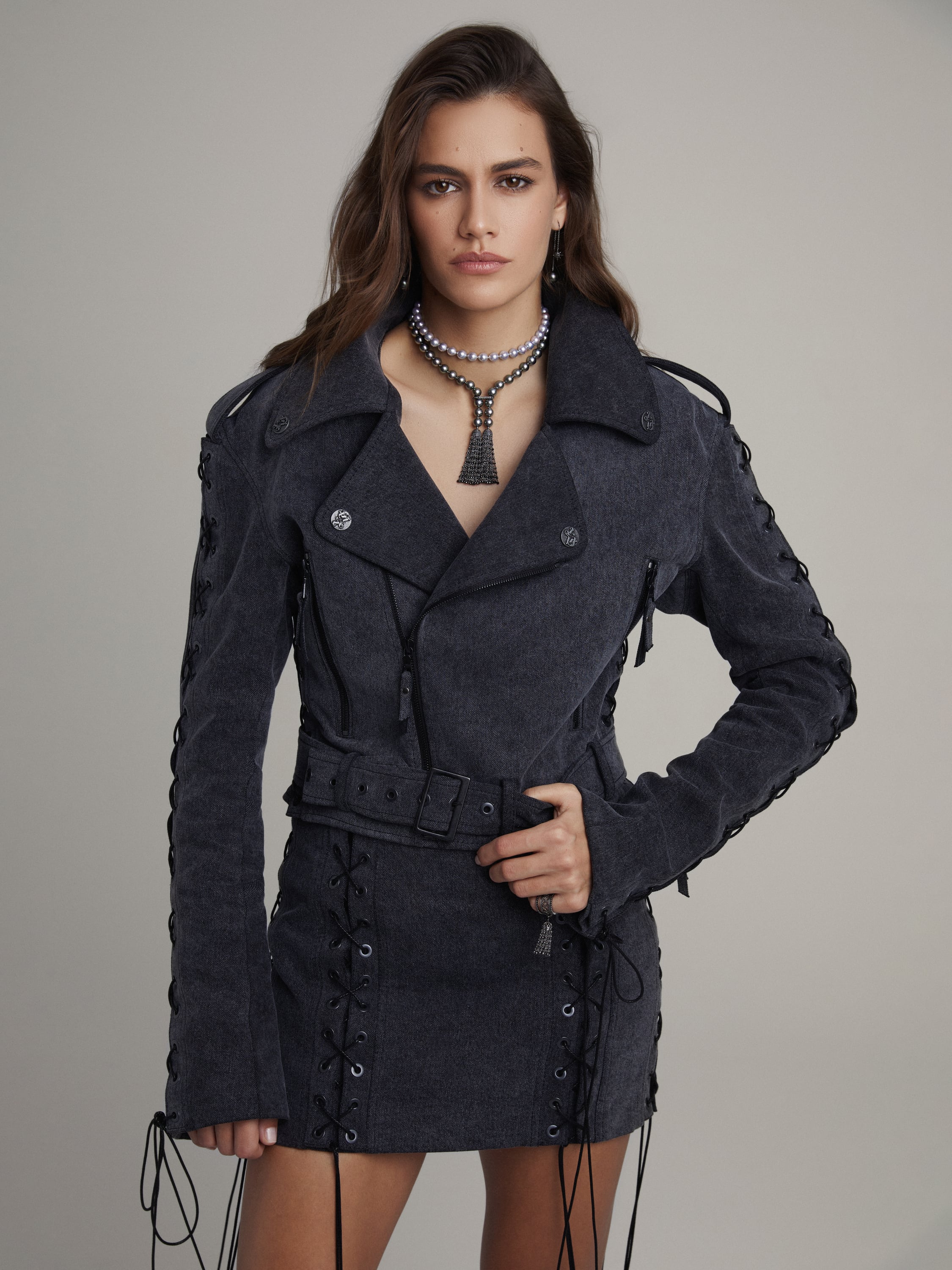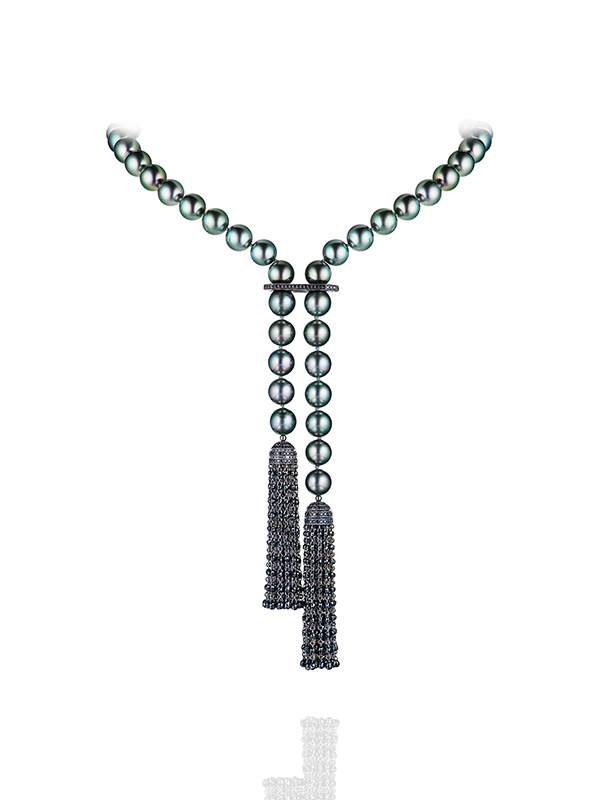 Tie necklace made of blackened gold, set with 500 black briolettes with a total weight of 26.99 ct, 214 round black diamonds 0.93 ct and 47 black pearls with a total weight of 46.95 g and a diameter of 8.3–10 mm.