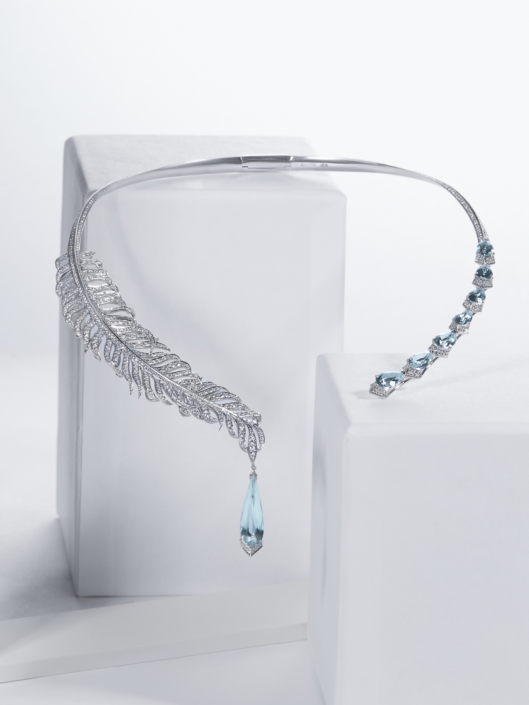 A 750 white gold necklace set with 818 round diamonds with a total weight of 5.4 ct, 1 aquamarine weighing 2.80 ct, and 7 aquamarines with a total weight of 5.37 ct.