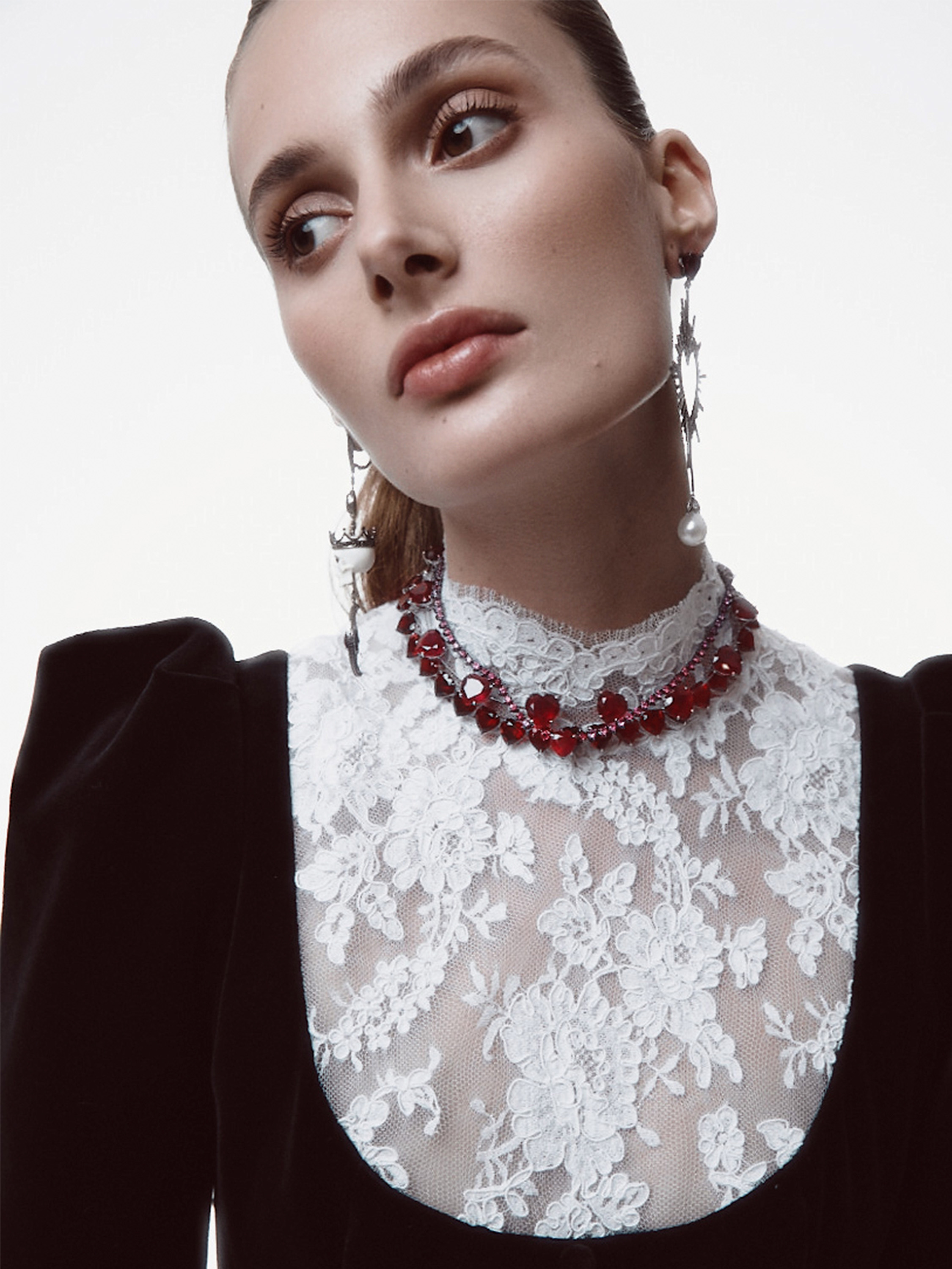 A white gold necklace inlaid with 36 heart-cut garnets with a total weight of 149.92 ct.