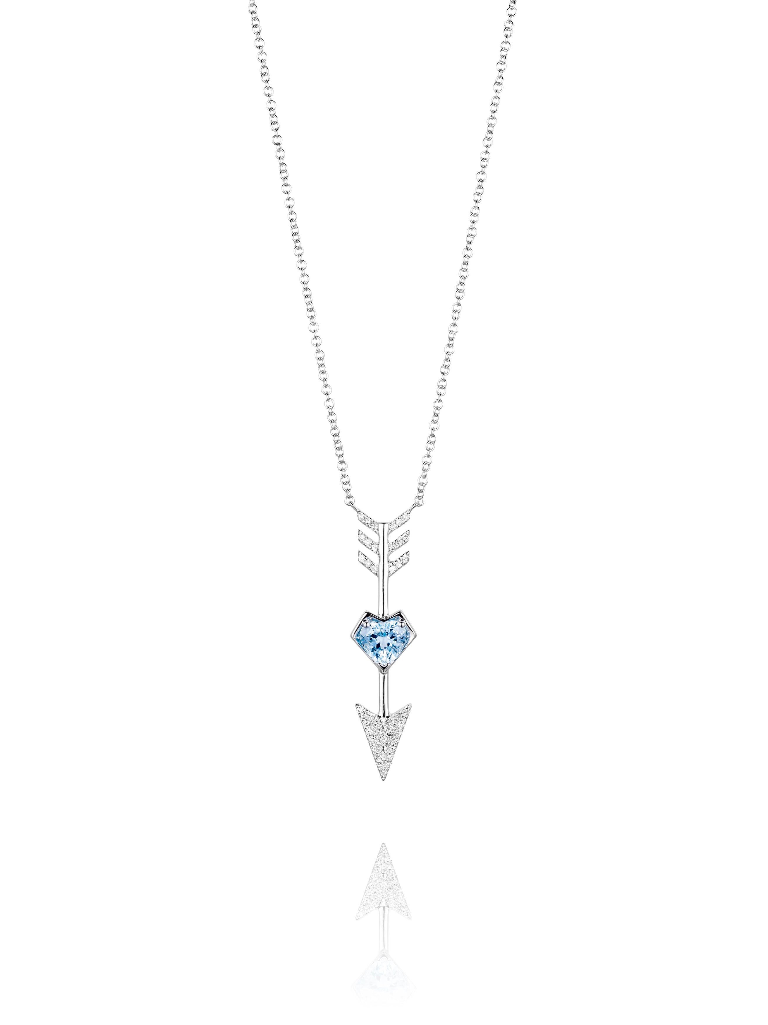 Necklace in white gold with a pendant featuring a heart-cut topaz weighing 0.50 ct and 44 round diamonds with a total weight of 0.10 ct.