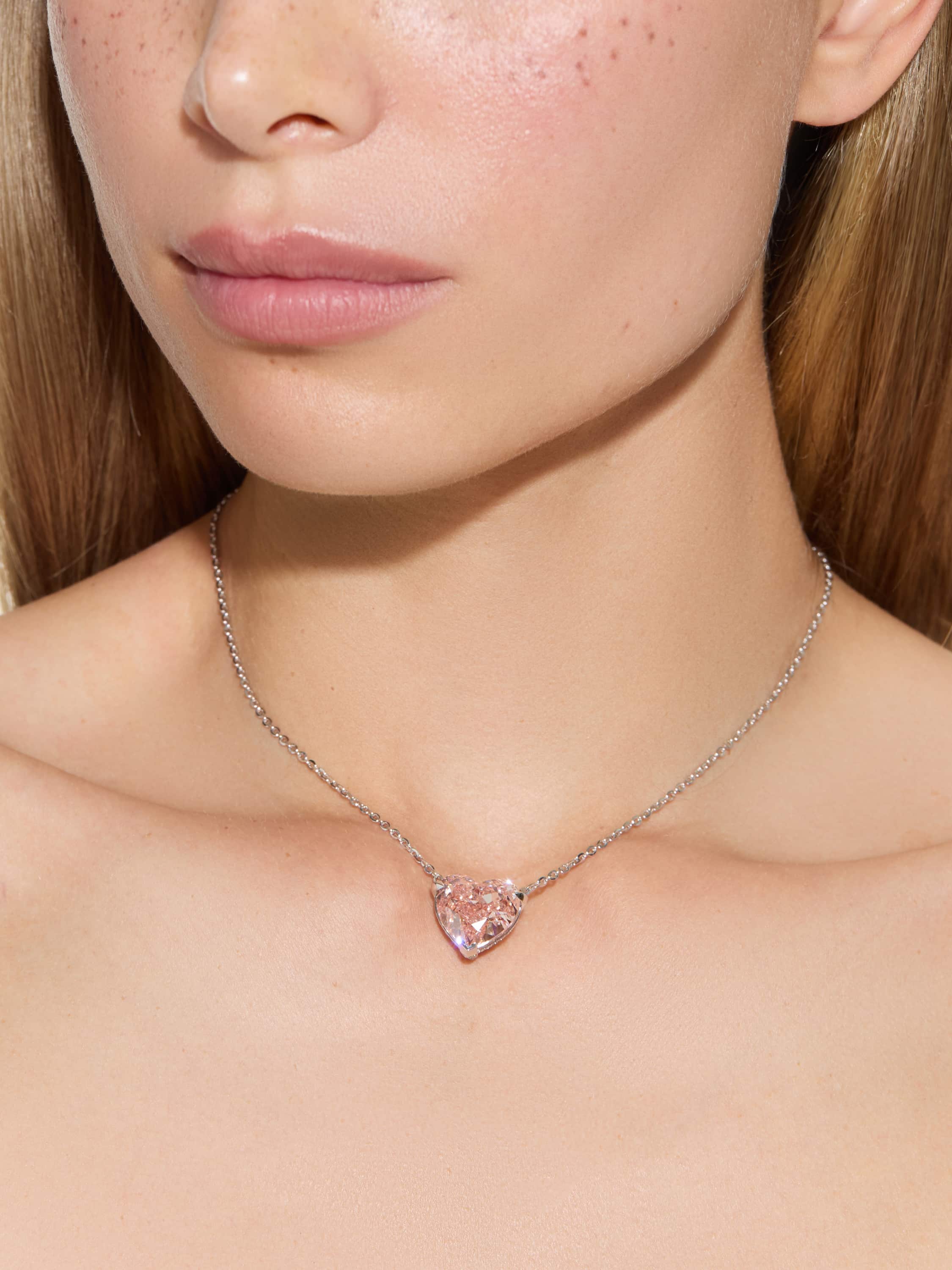 White gold necklace with a pink LG heart-cut diamond 3.05 ct FIP/VS1 and 68 round diamonds with a total weight of 0.27 ct.