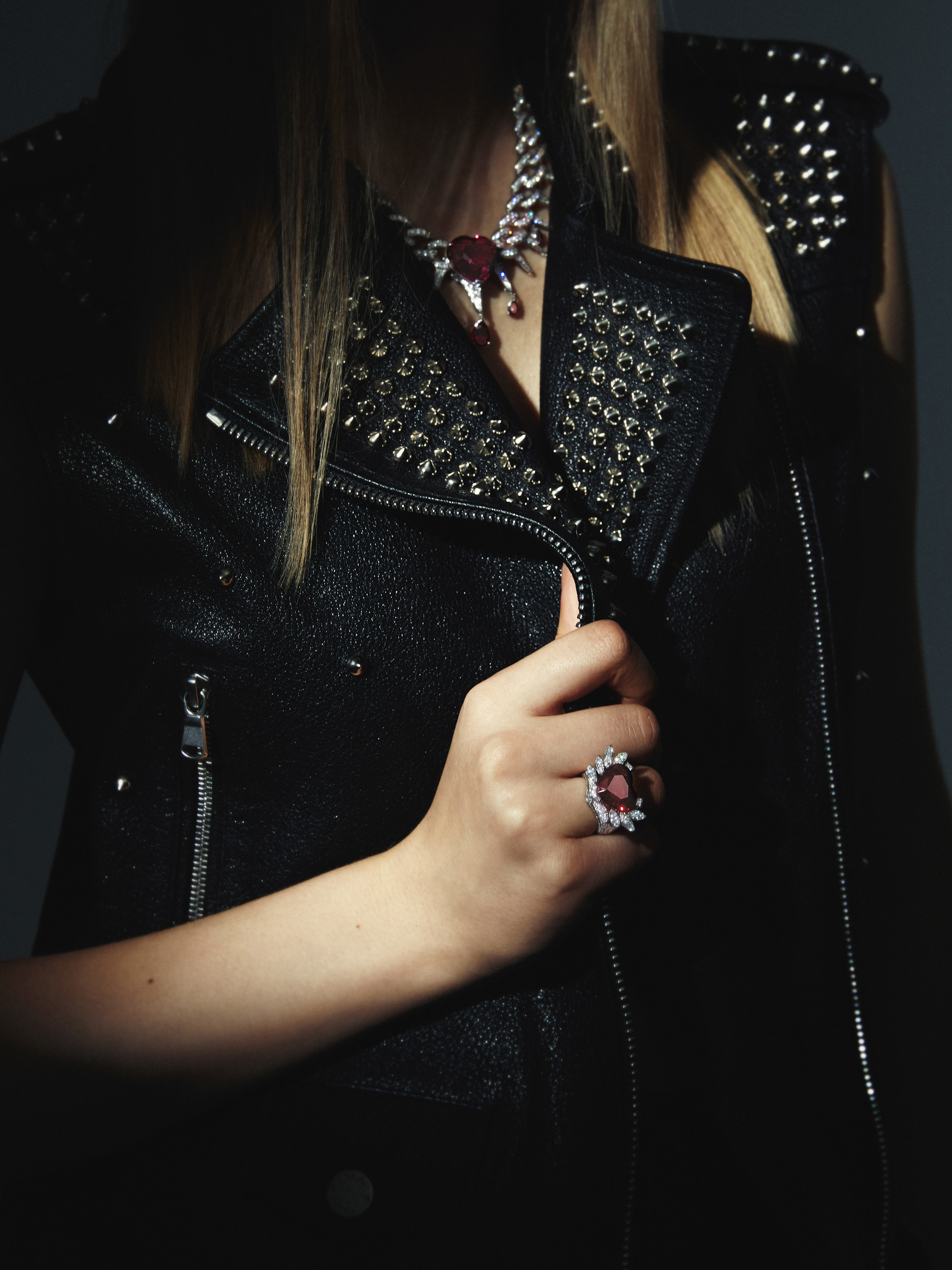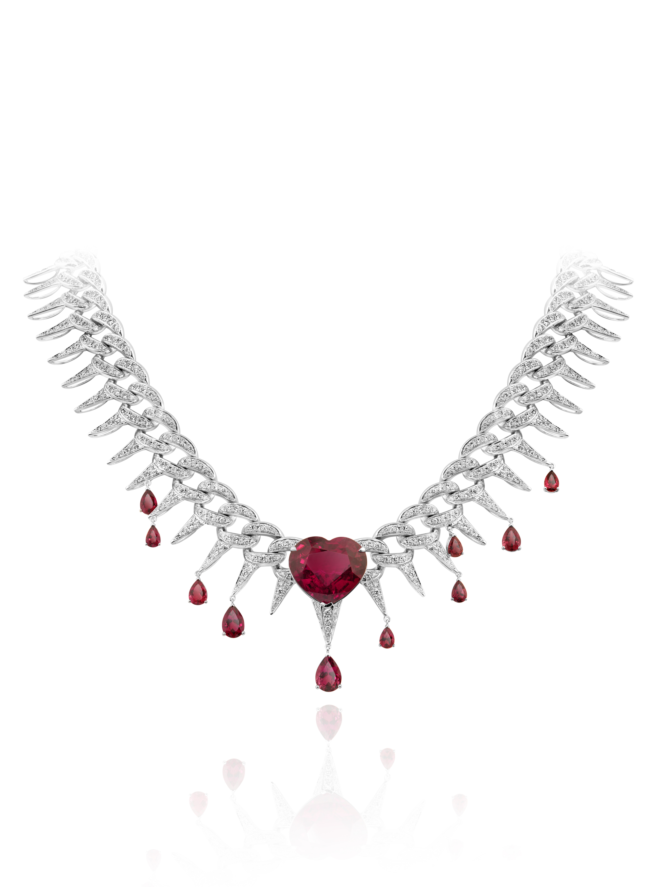 White gold necklace with a heart-cut rubellite weighing 27.8 ct, 927 round-cut diamonds with a total weight of 15.8 ct, 10 pear-cut rubellites with a total weight of 7.28 ct, and 1 round-cut ruby weighing 0.05 ct.