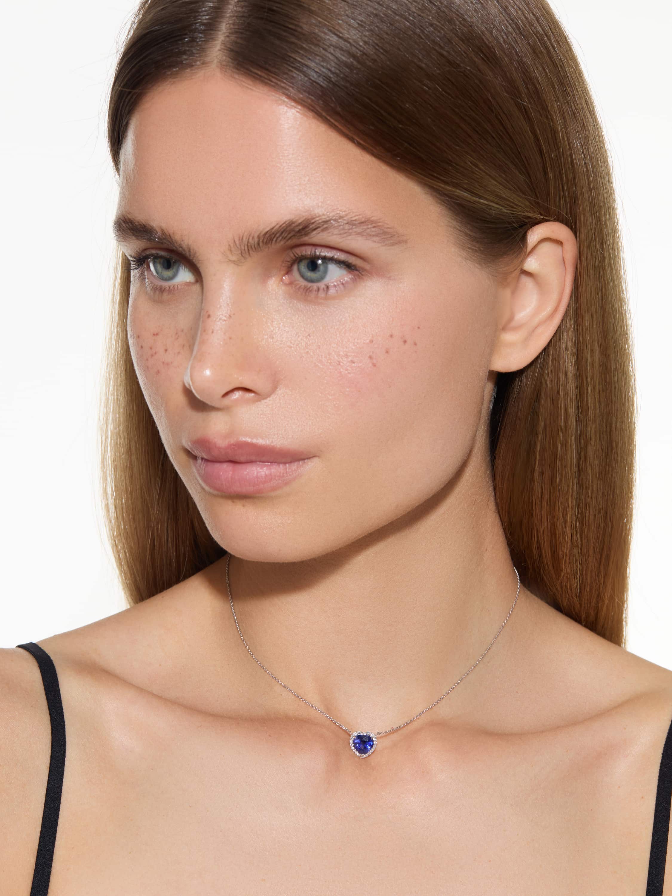 White gold necklace with a heart-cut sapphire weighing 2.42 ct, 78 round diamonds of 0.29 ct and 1 diamond weighing 0.09 ct.