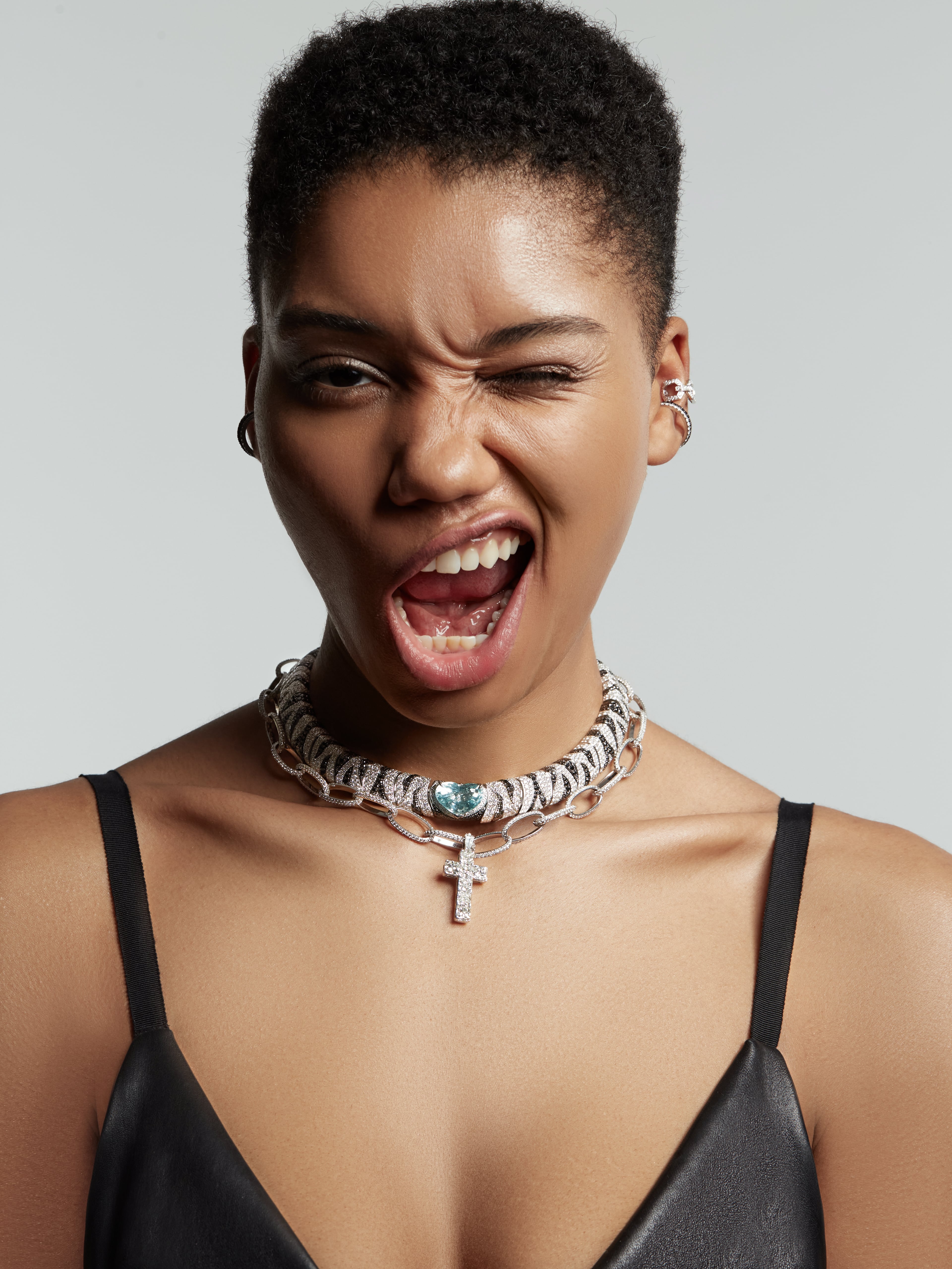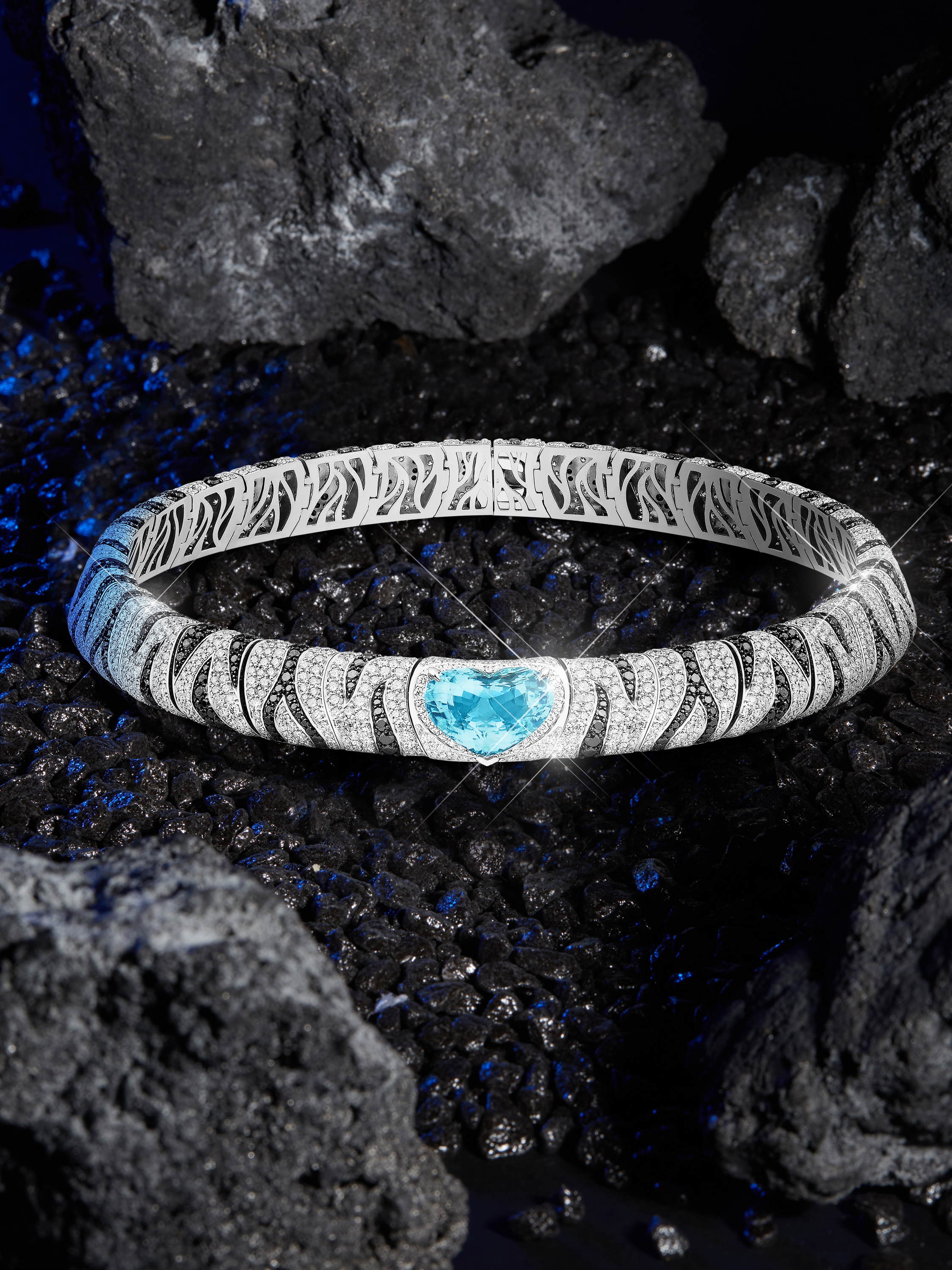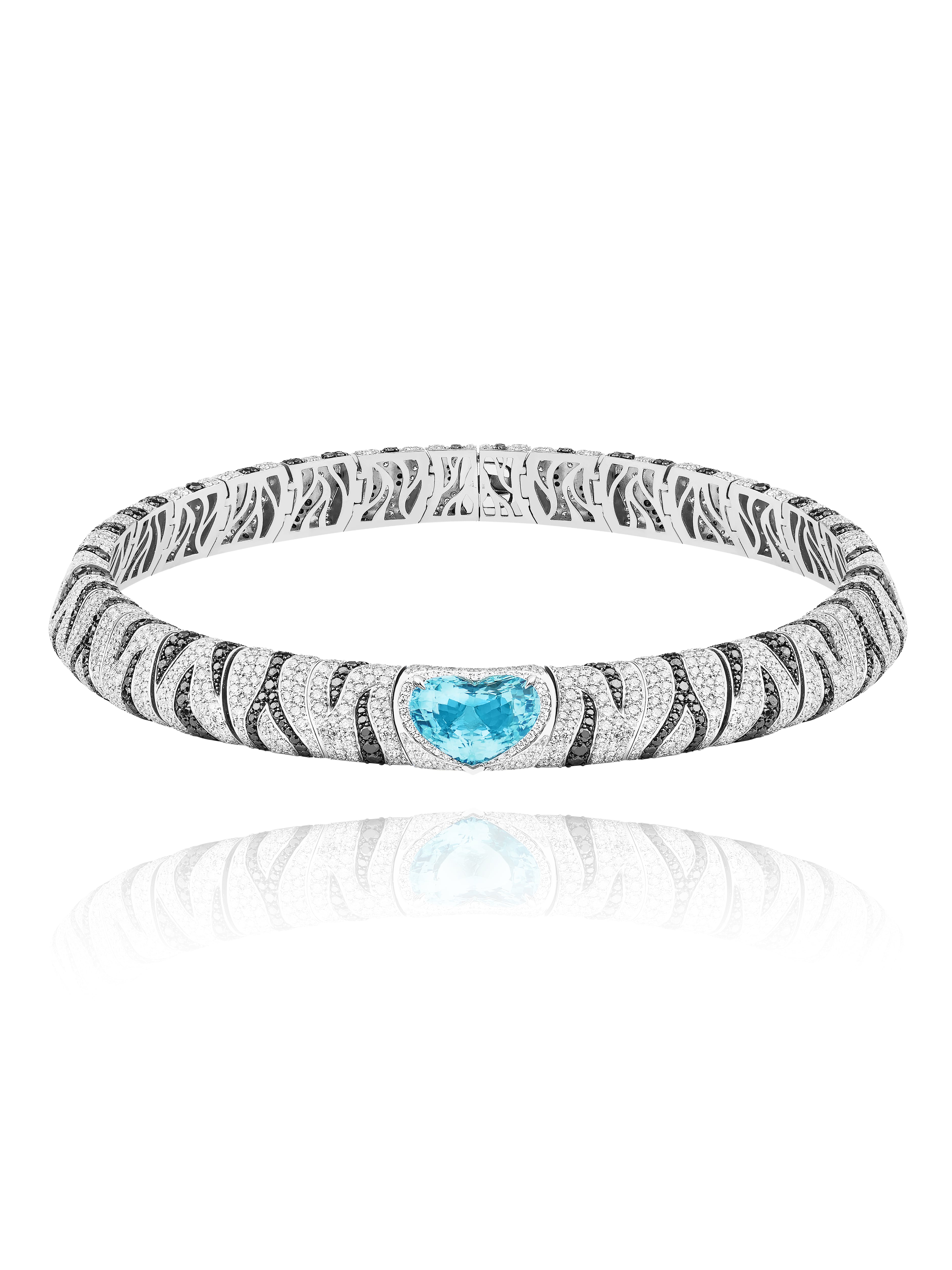 A white gold necklace set with a heart-cut Paraiba tourmaline weighing 14.63 ct, 1514 round brilliant-cut diamonds with a total weight of 23.31 ct, and 723 round brilliant-cut black diamonds with a total weight of 12.38 ct.
