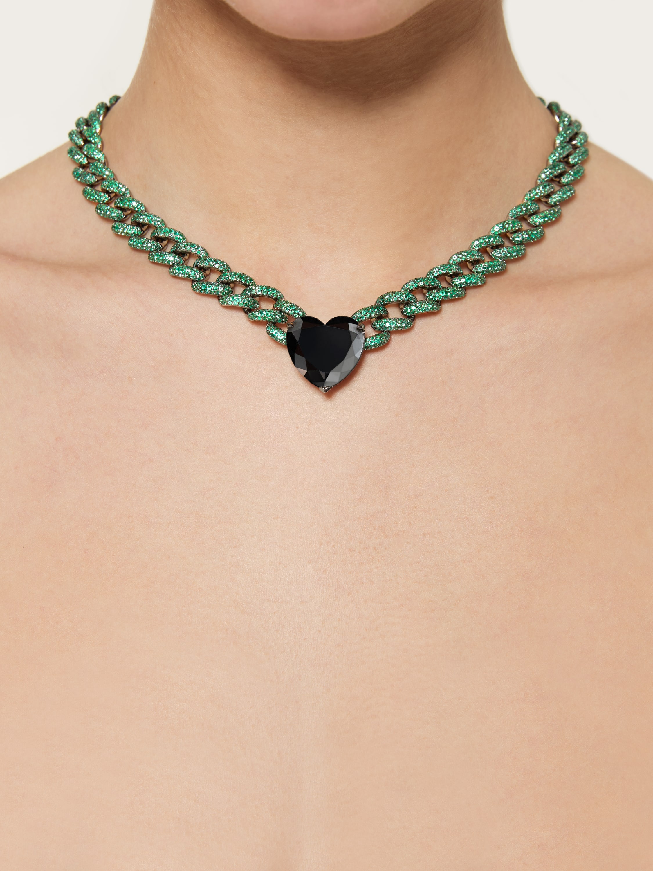 Blackened gold necklace with a heart-cut black diamond weighing 30.21 ct and 2,404 emeralds totaling 14.33 ct.