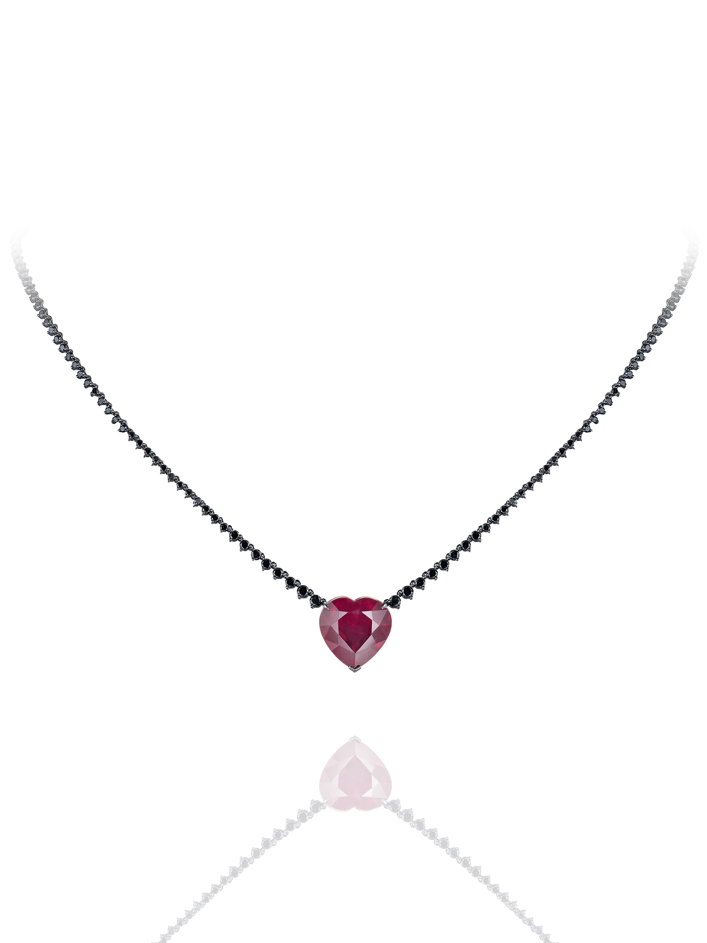 Necklace in blackened gold, inlaid with a heart-cut ruby weighing 8.01 ct and 206 black round-cut diamonds with a total weight of 9.15 ct.