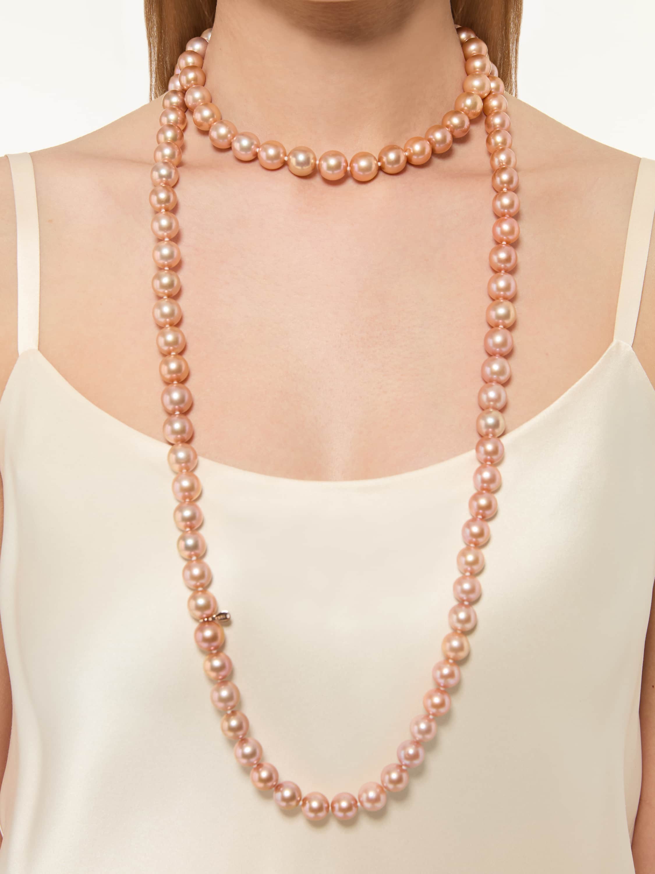 Rose gold necklace with 106 pearls in a rare orange-pink hue weighing 235.1 g, diameter 11.0–13.0, and 1 LG round-cut diamond weighing 0.01 ct.