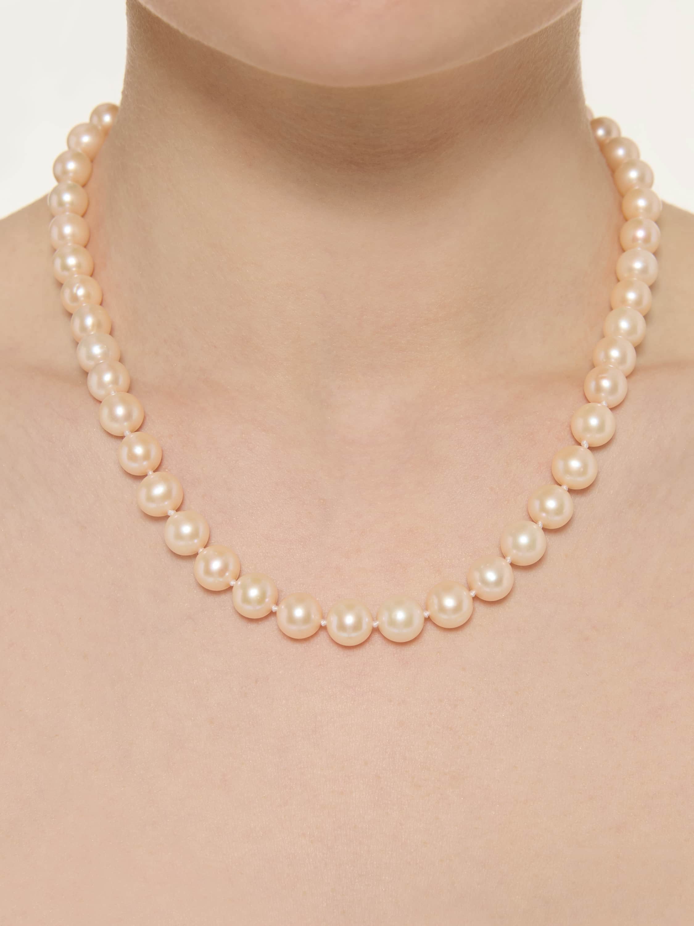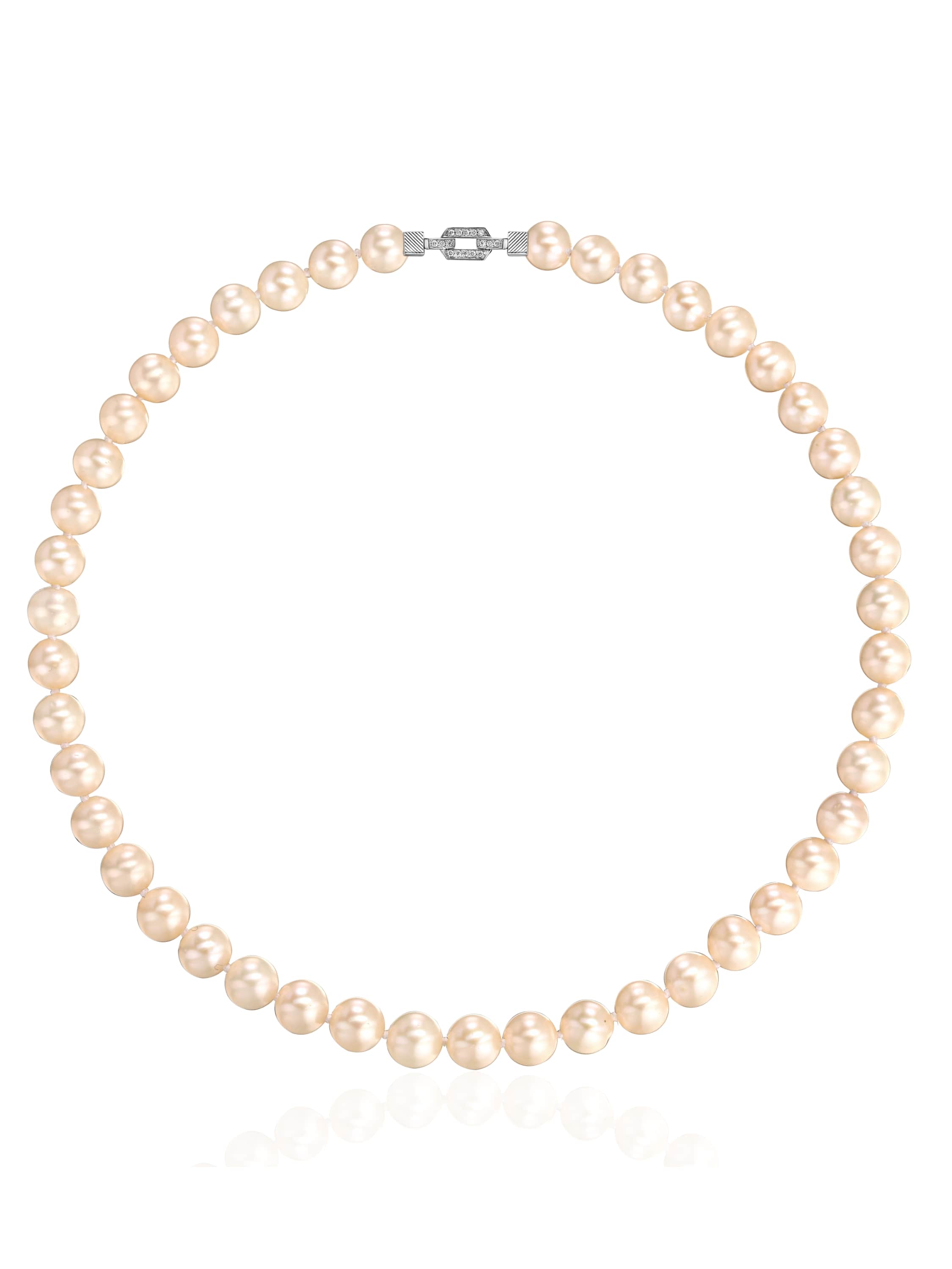 White gold necklace with 45 peach pearls d 8.5-9.5 43.77 g and 20 round diamonds weighing 0.09 ct.