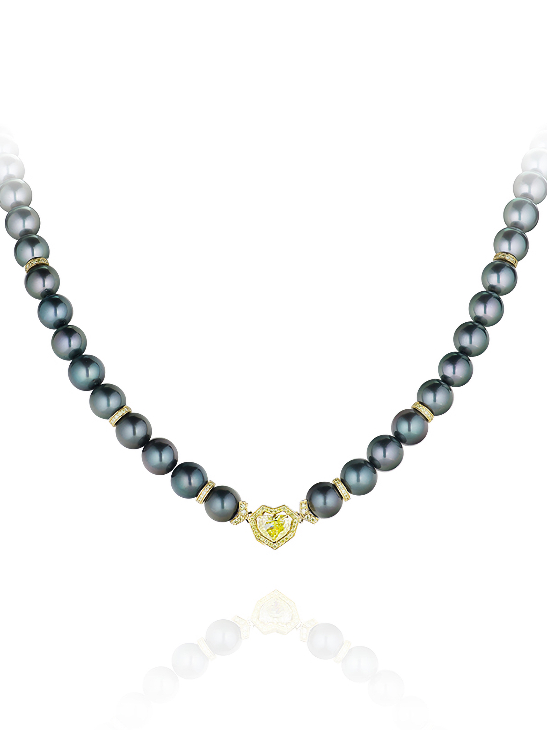 A transformable necklace in yellow gold, set with a yellow diamond (Fancy Intense Yellow shade) in a heart cut weighing 2.11 ct, 280 round yellow diamonds with a total weight of 2.27 ct, and 71 pearls weighing 61.25 g and measuring 10.2–10.9 mm in diameter.