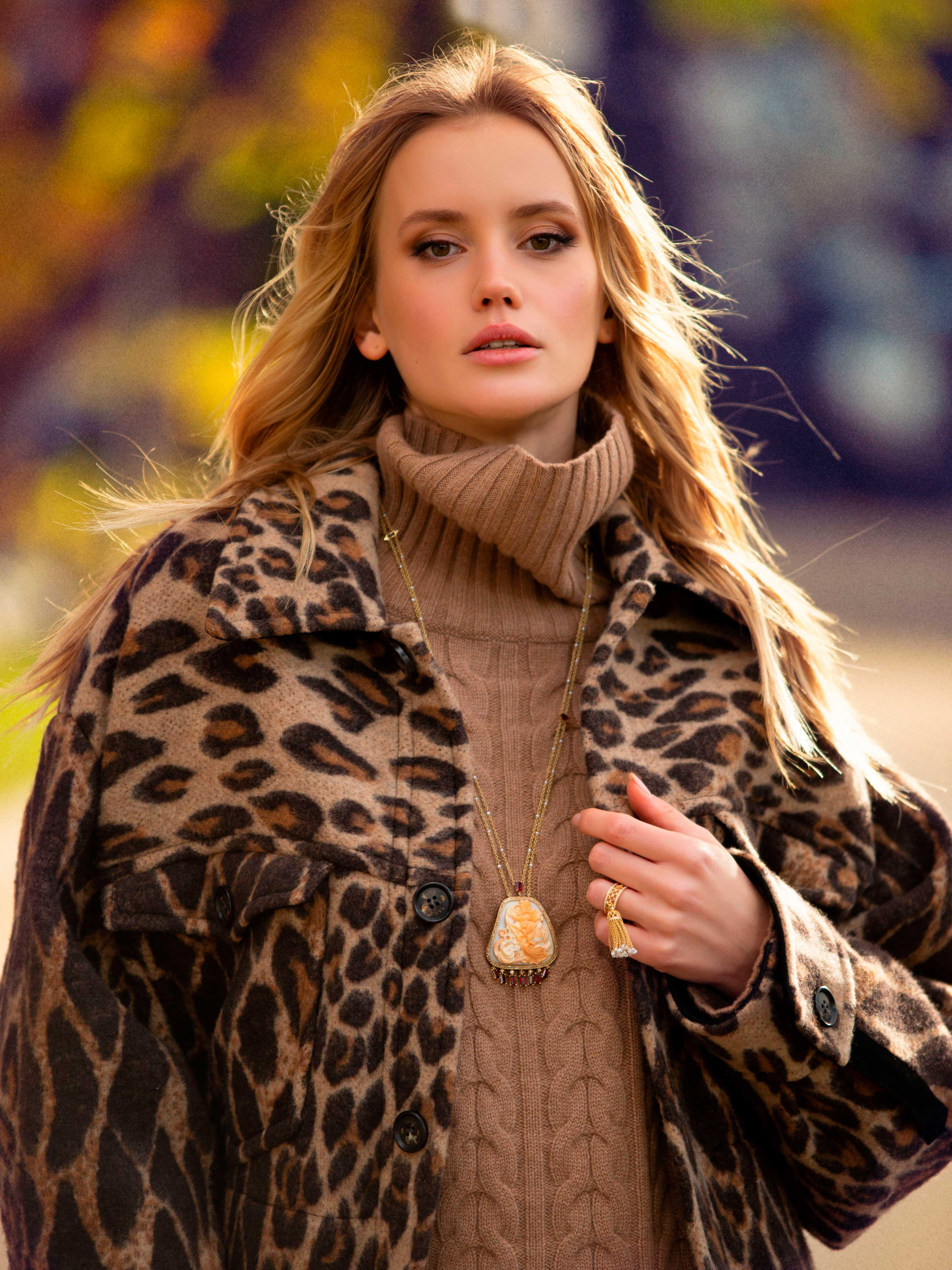 A gold necklace with 22 freshwater pearls with a total weight of 0.290 g, 33 Akoya pearls with a total weight of 0.430 g, 110 round diamonds with a total weight of 1.77 ct, 13 garnets with a total weight of 5.89 ct, and 1 shell cameo weighing 15.90 g.