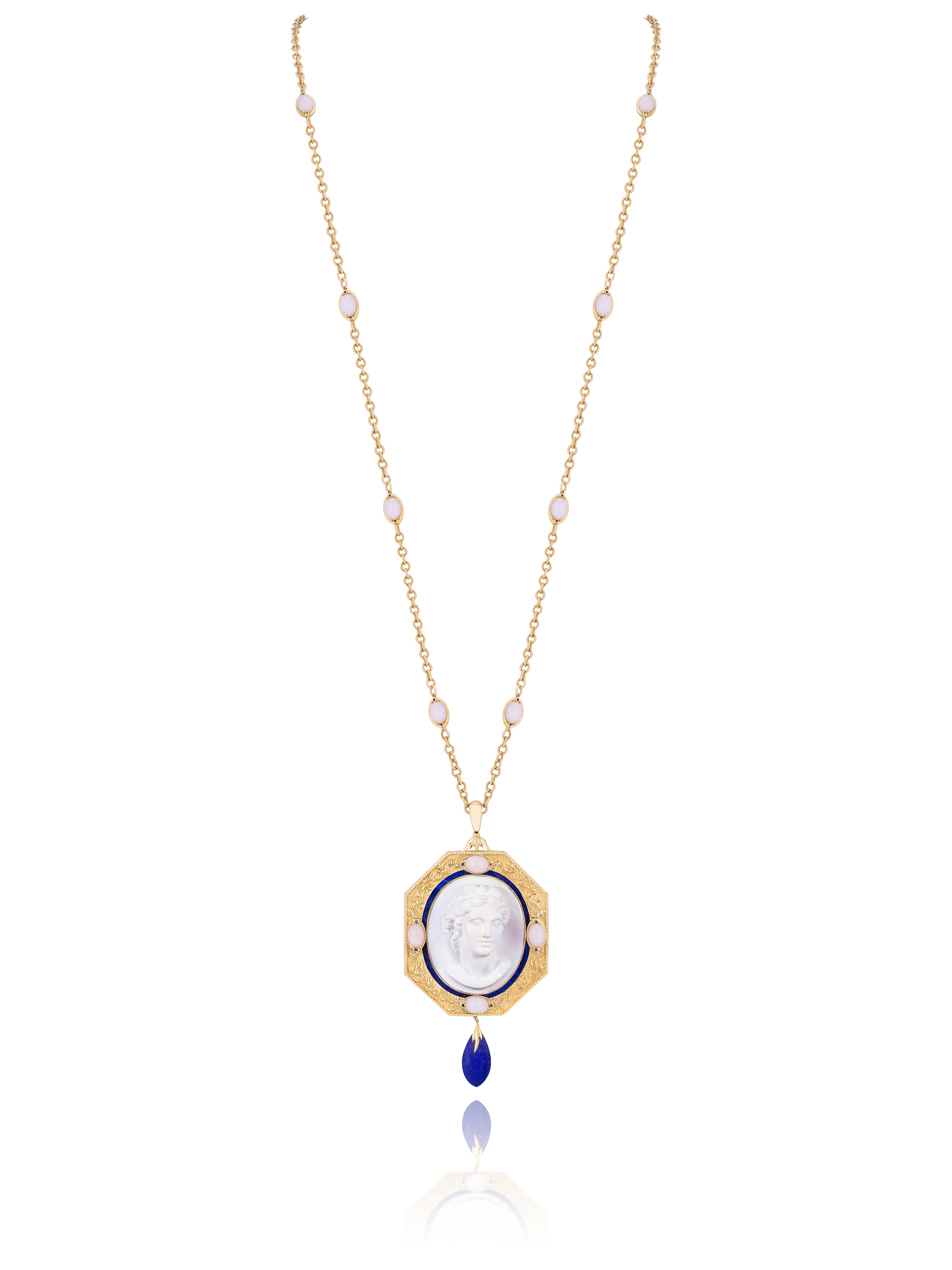 Necklace in 585 yellow gold with 28 sapphires weighing 0.16 ct, lapis lazuli, 14 opals weighing 2.46 g, 2 lapis lazuli stones weighing 3.08 g, and a shell cameo weighing 17.26 g.