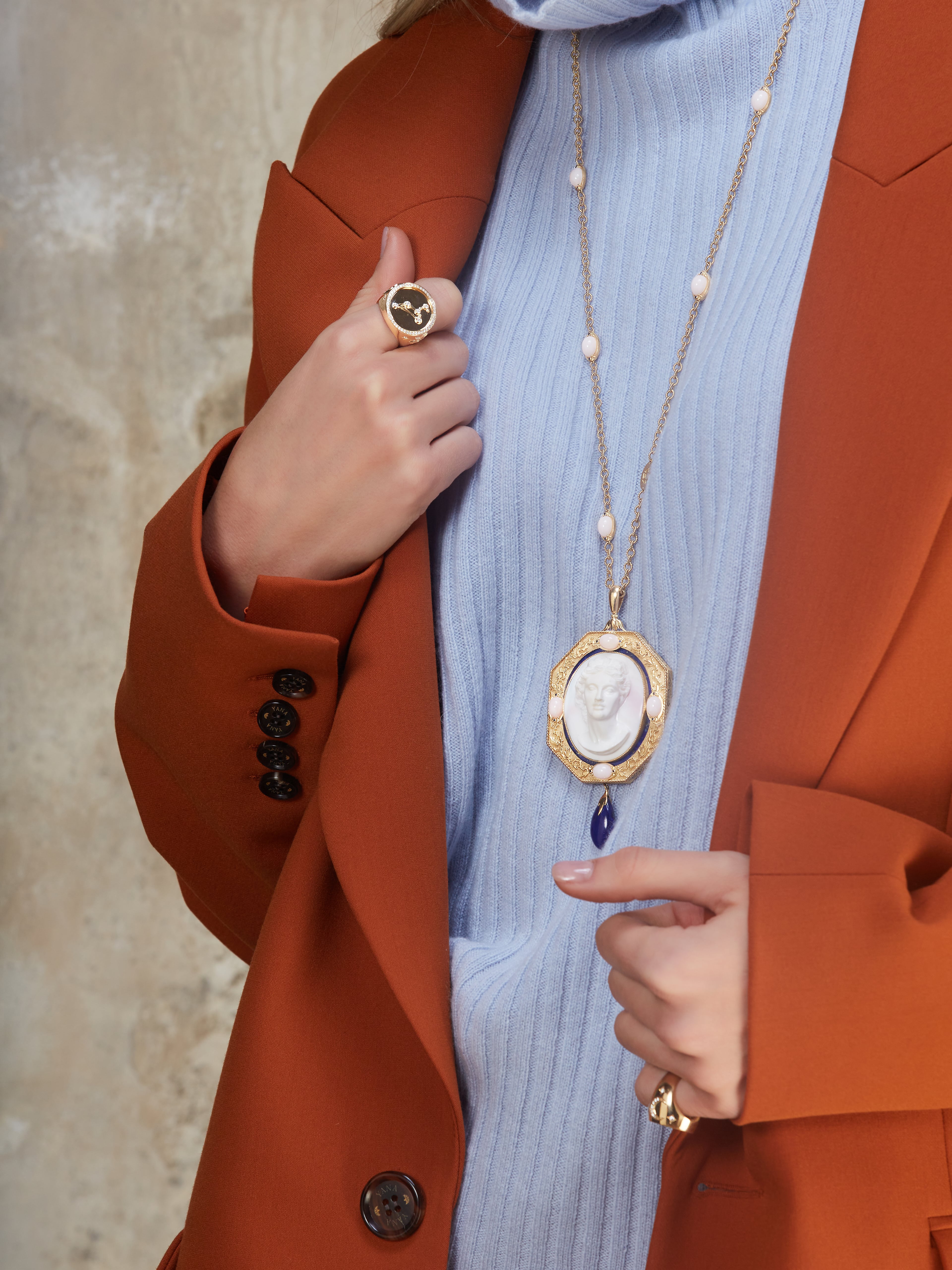 Yellow Gold, Sapphires and Shell Cameo Necklace