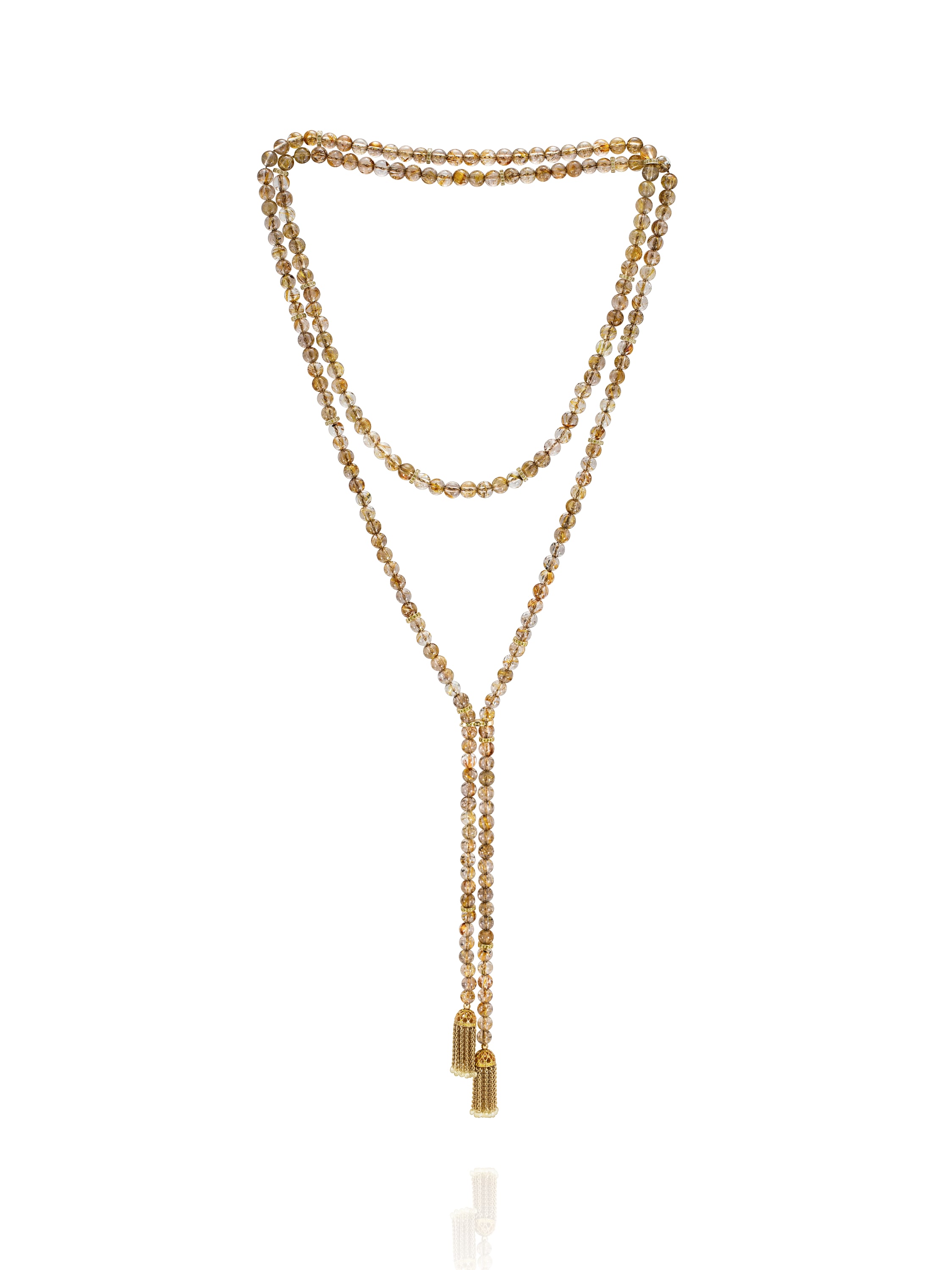 Yellow gold necklace-belt with 217 rutilated quartz beads 6.00 73.870 and 48 diamonds weighing 4.56 ct and 413 yellow round-cut diamonds weighing 1.84 ct.