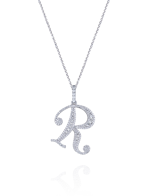 White gold necklace with an R-shaped pendant set with 166 round brilliant-cut H/SI diamonds with a total weight of 0.67 ct.