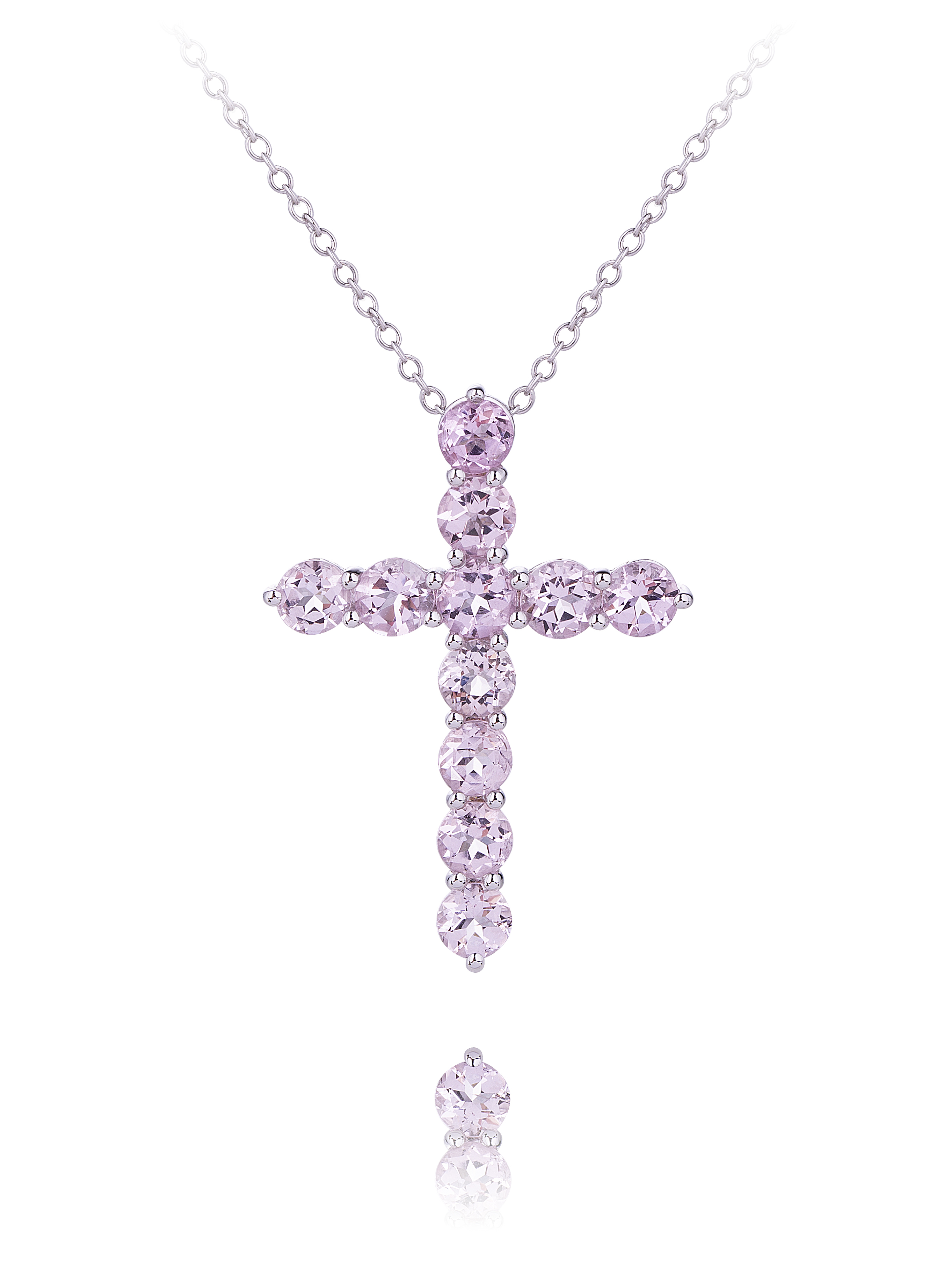 Necklace with a cross in white gold, round diamonds 0.06 ct and morganites with a total weight of 2.63 ct.