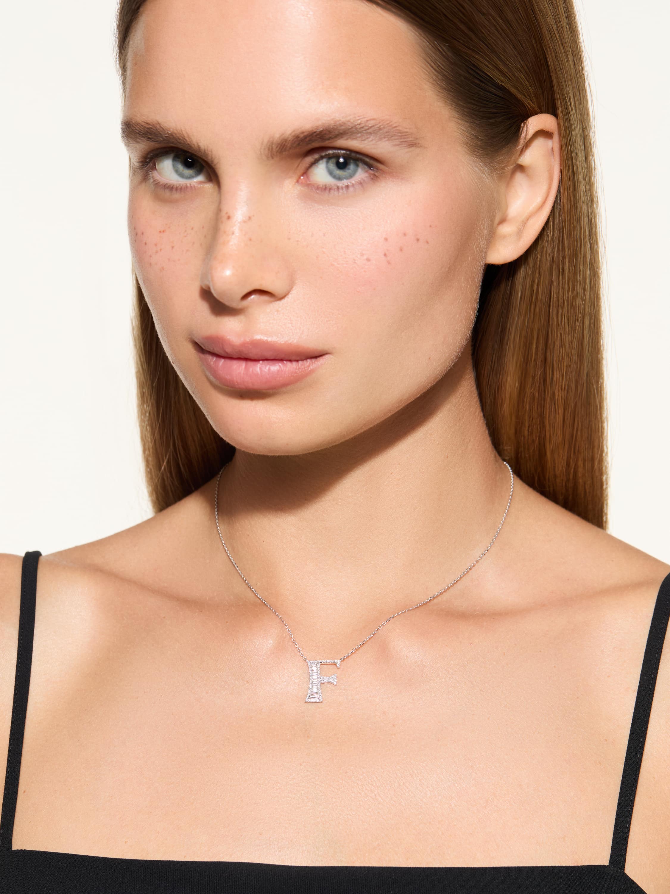 White gold and diamond necklace with a pendant in the shape of the letter F