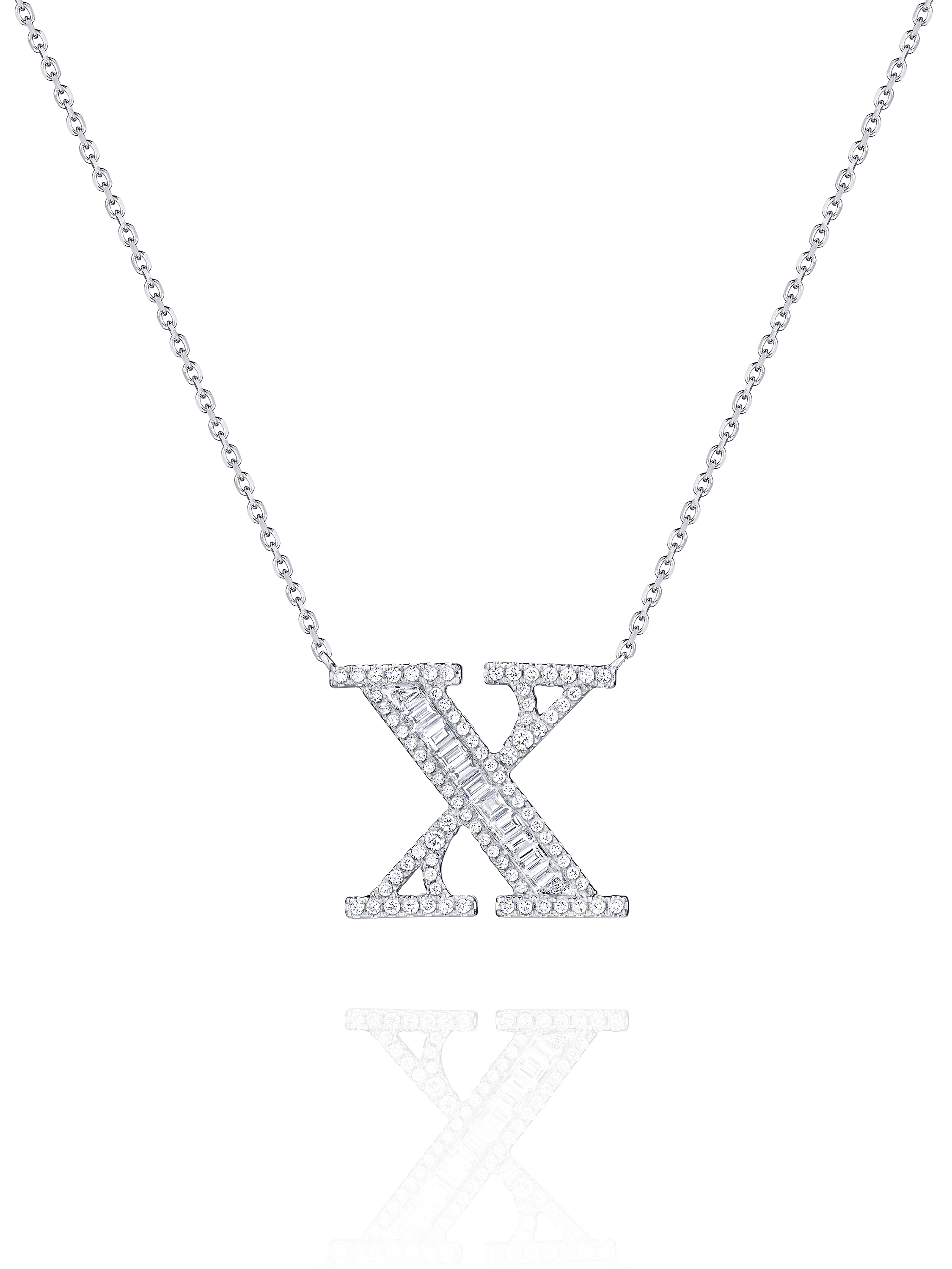 Necklace with a pendant in white gold in the shape of the letter X, set with 80 round diamonds with a total weight of 0.33 ct and 12 baguette-cut diamonds with a total weight of 0.33 ct.
