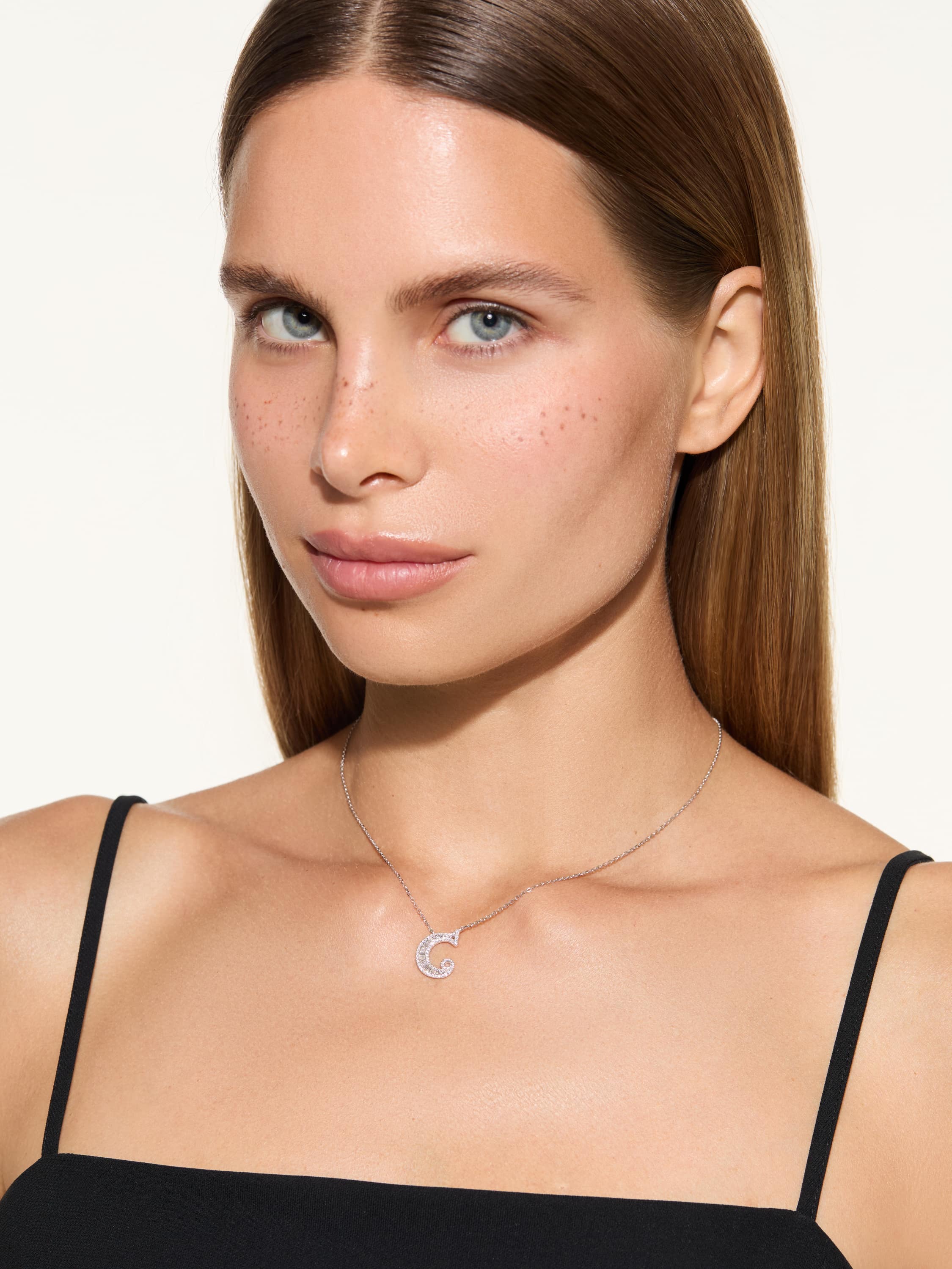 White gold and diamond necklace with a C-shaped pendant