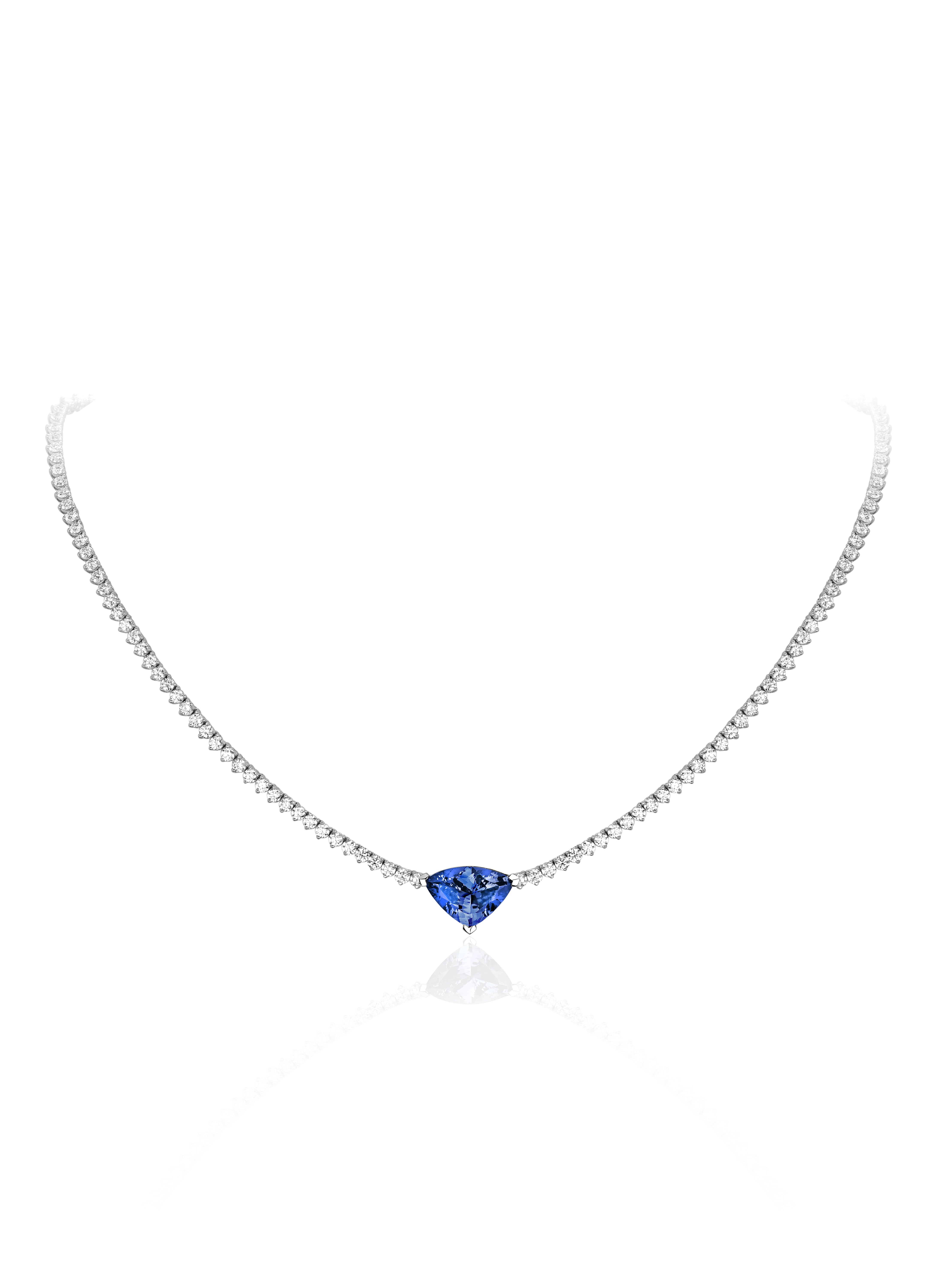 Necklace with a pendant in white gold with tanzanite weighing 4.77 ct and 209 round-cut diamonds with a total weight of 6.84 ct.