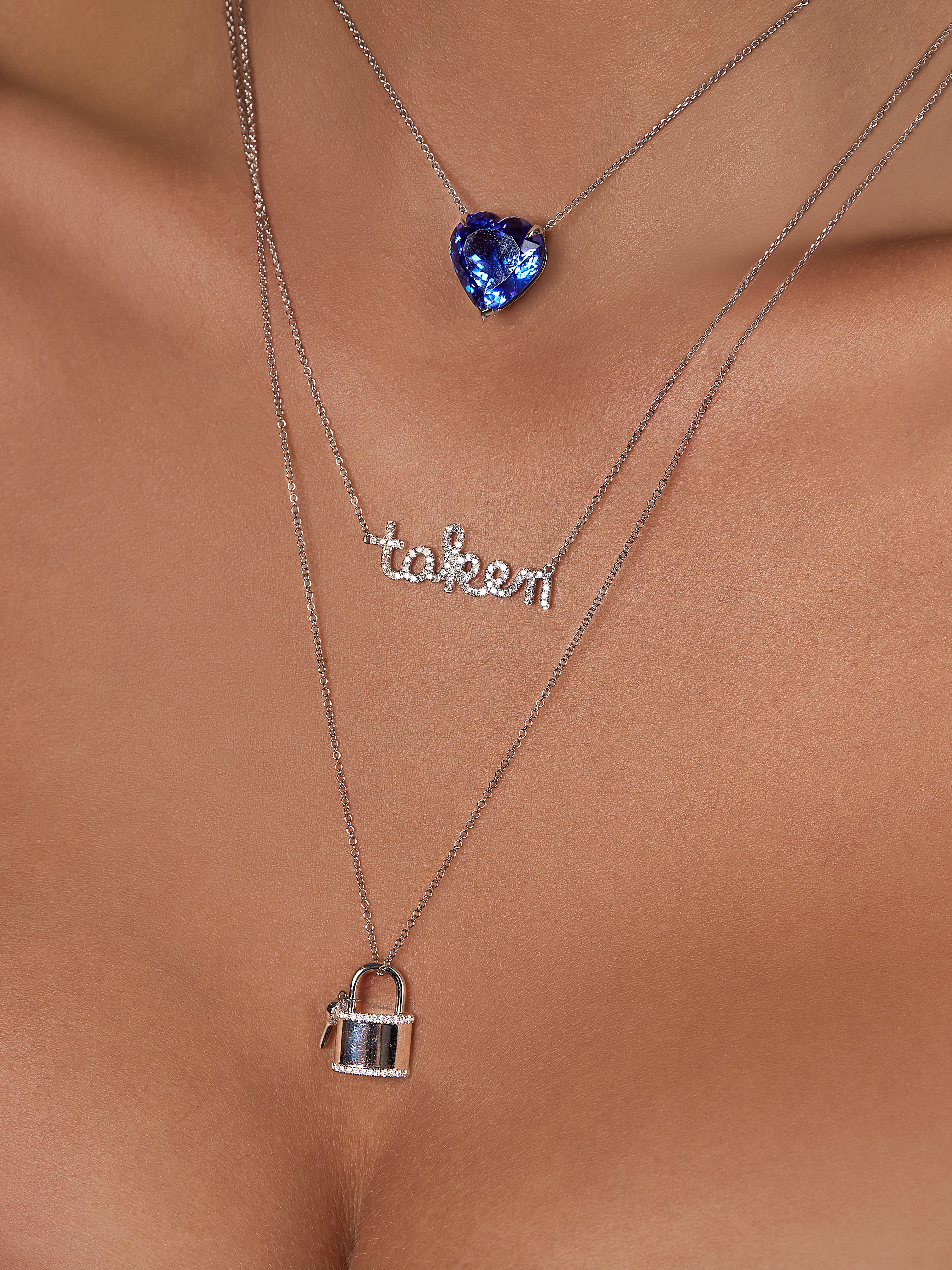 White gold necklace with a pendant with a heart-cut topaz, rock crystal and ruby