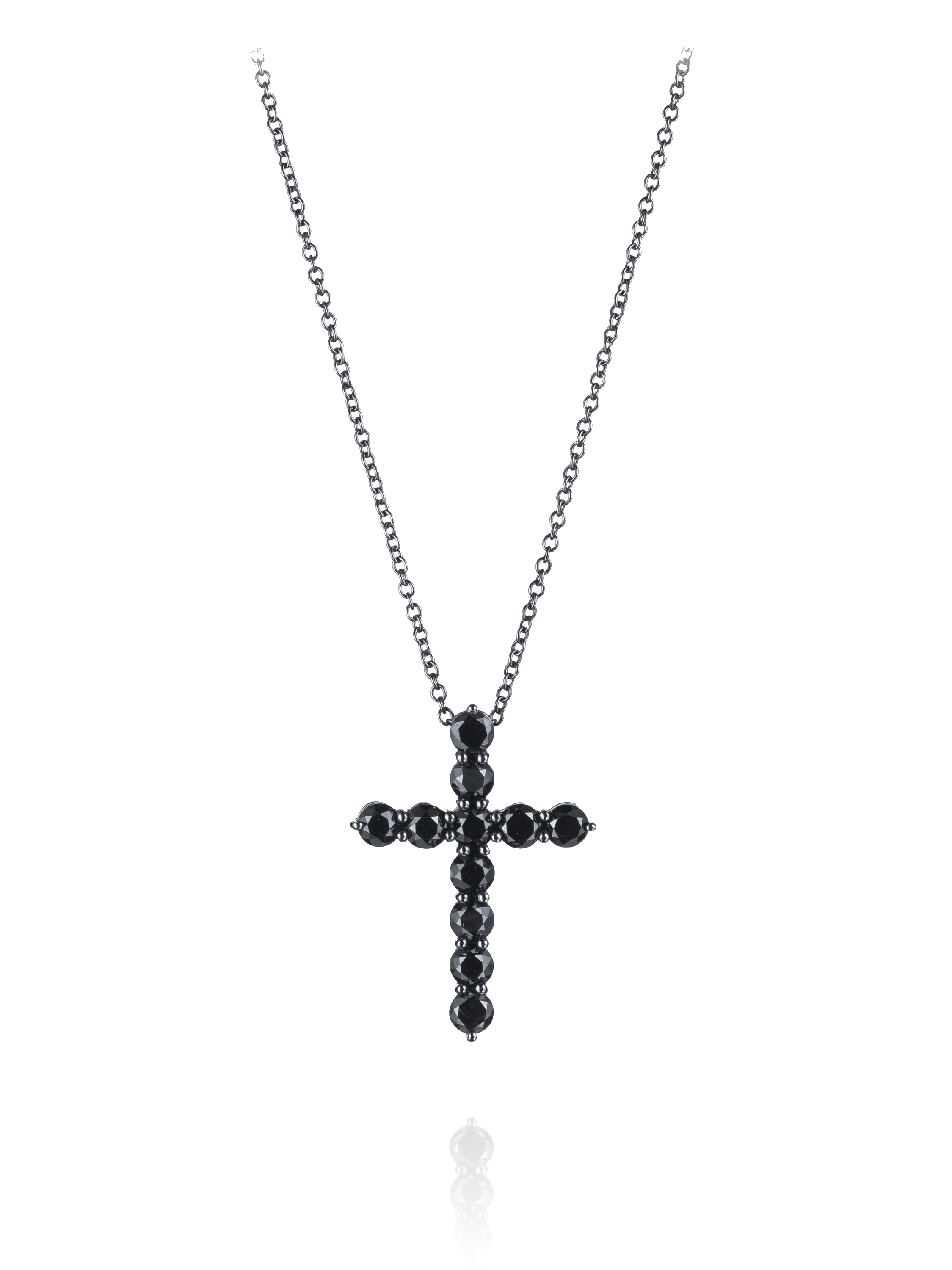 A necklace with a cross pendant made of blackened 18K gold and 11 round-cut black diamonds with a total weight of 3.71 ct. The necklace clasp is also adorned with 14 black diamonds with a total weight of 0.07 ct.