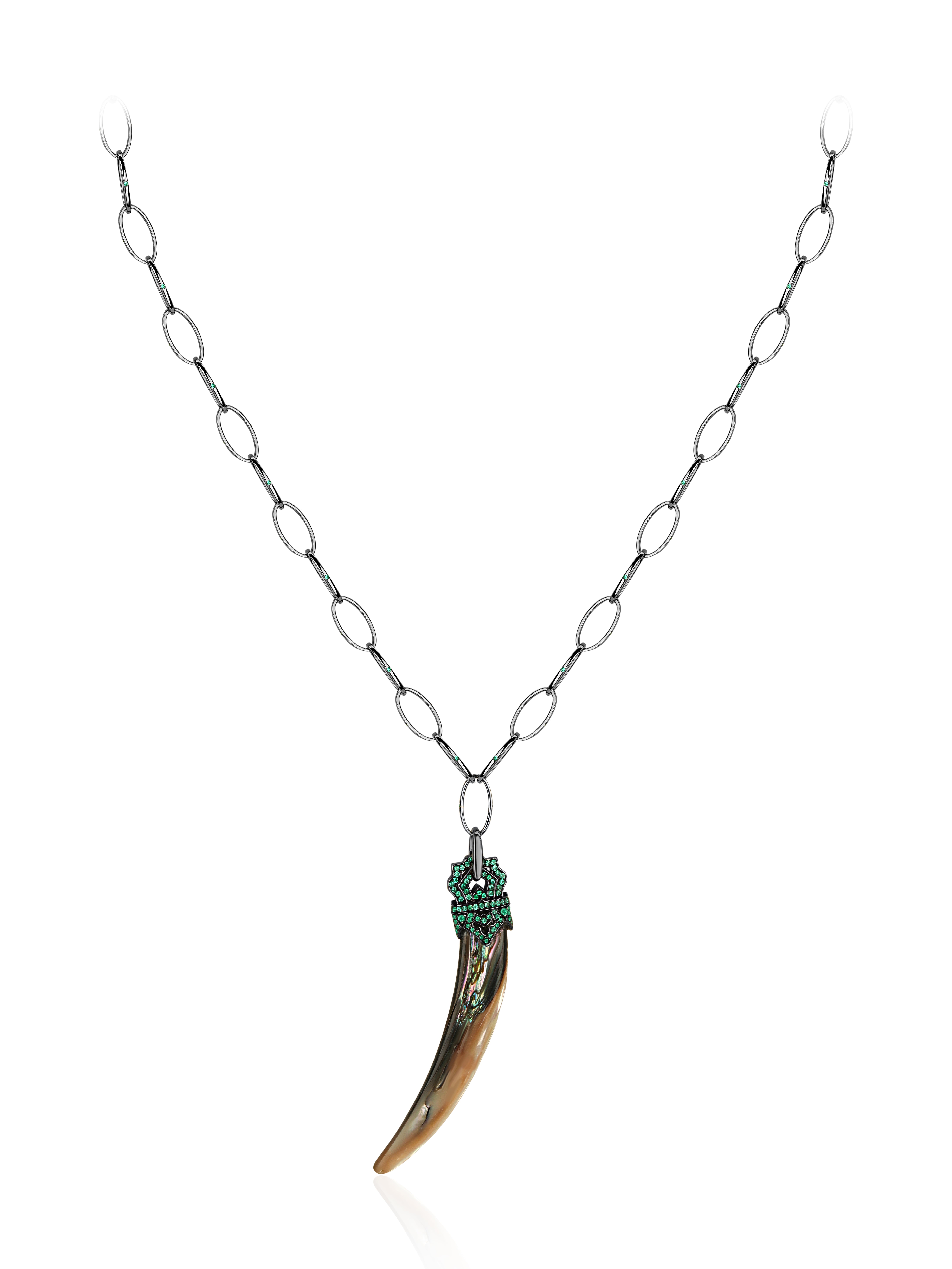 Necklace with a pendant in blackened gold with 256 round-cut emeralds with a total weight of 1.32 ct and mother-of-pearl weighing 5.53 g.