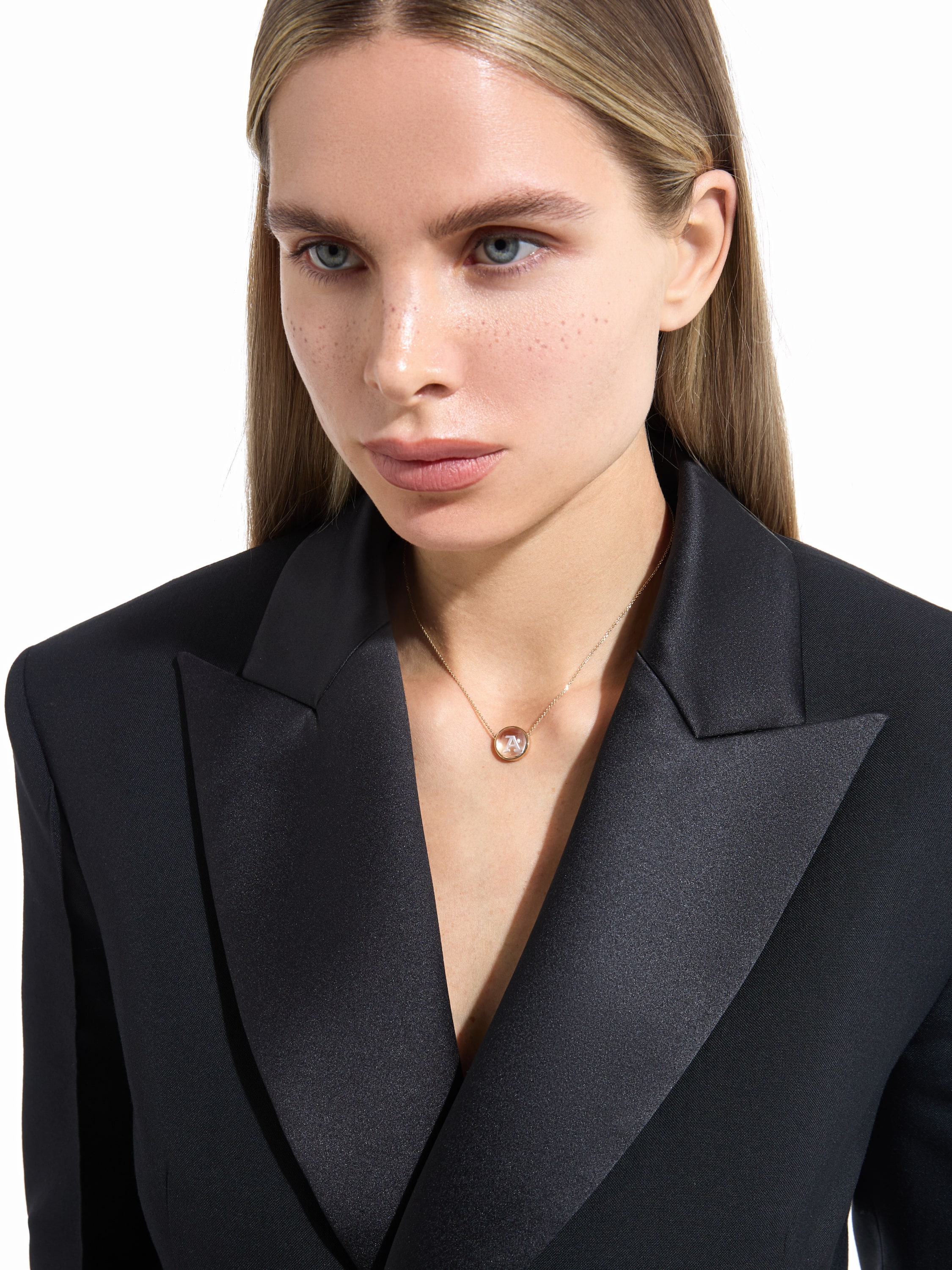 Gold necklace with a pendant featuring the letter A and a rock crystal weighing 6.13 ct.
