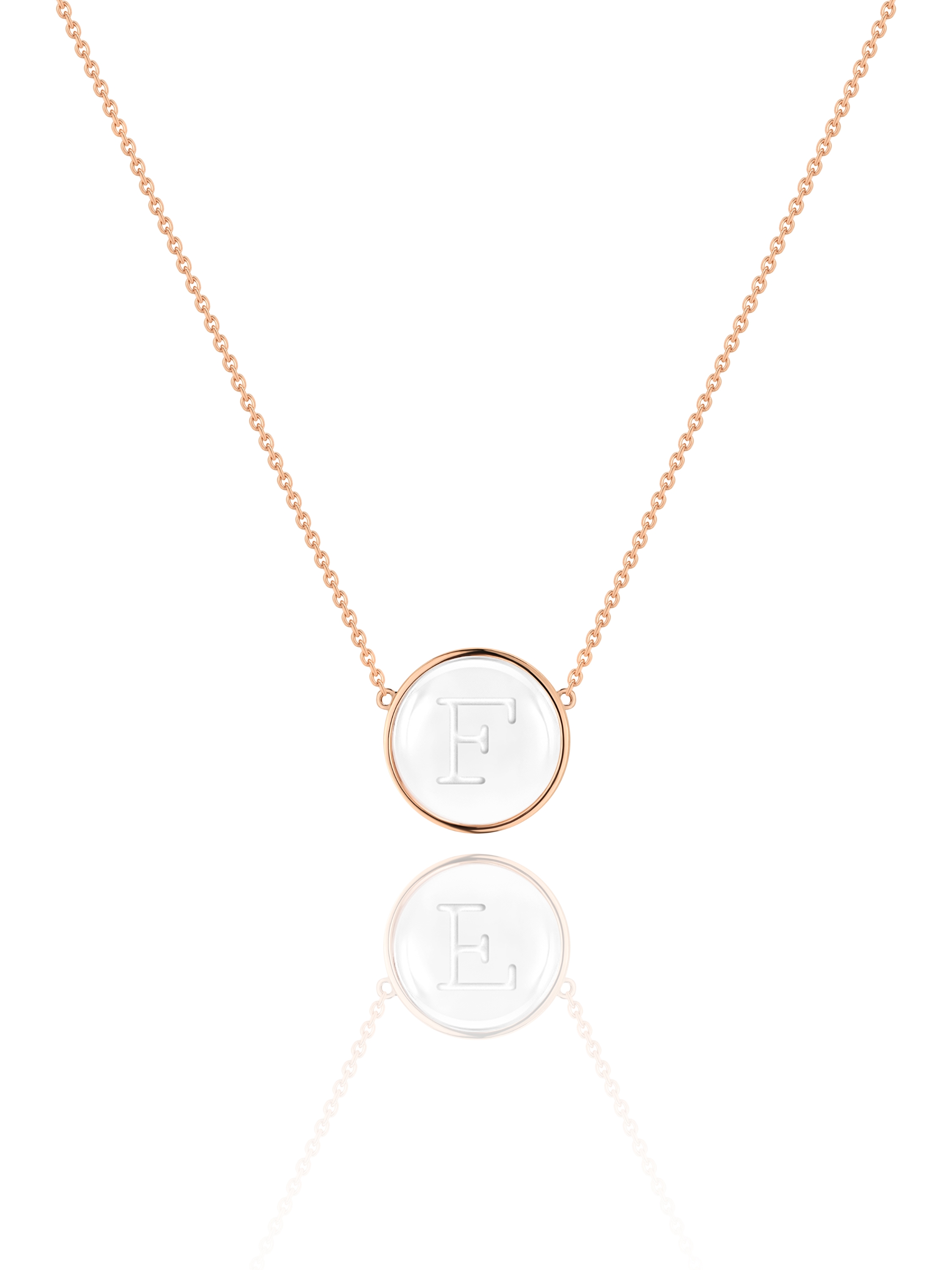 Rose gold necklace with letter F pendant with rock crystal 5.98 ct.