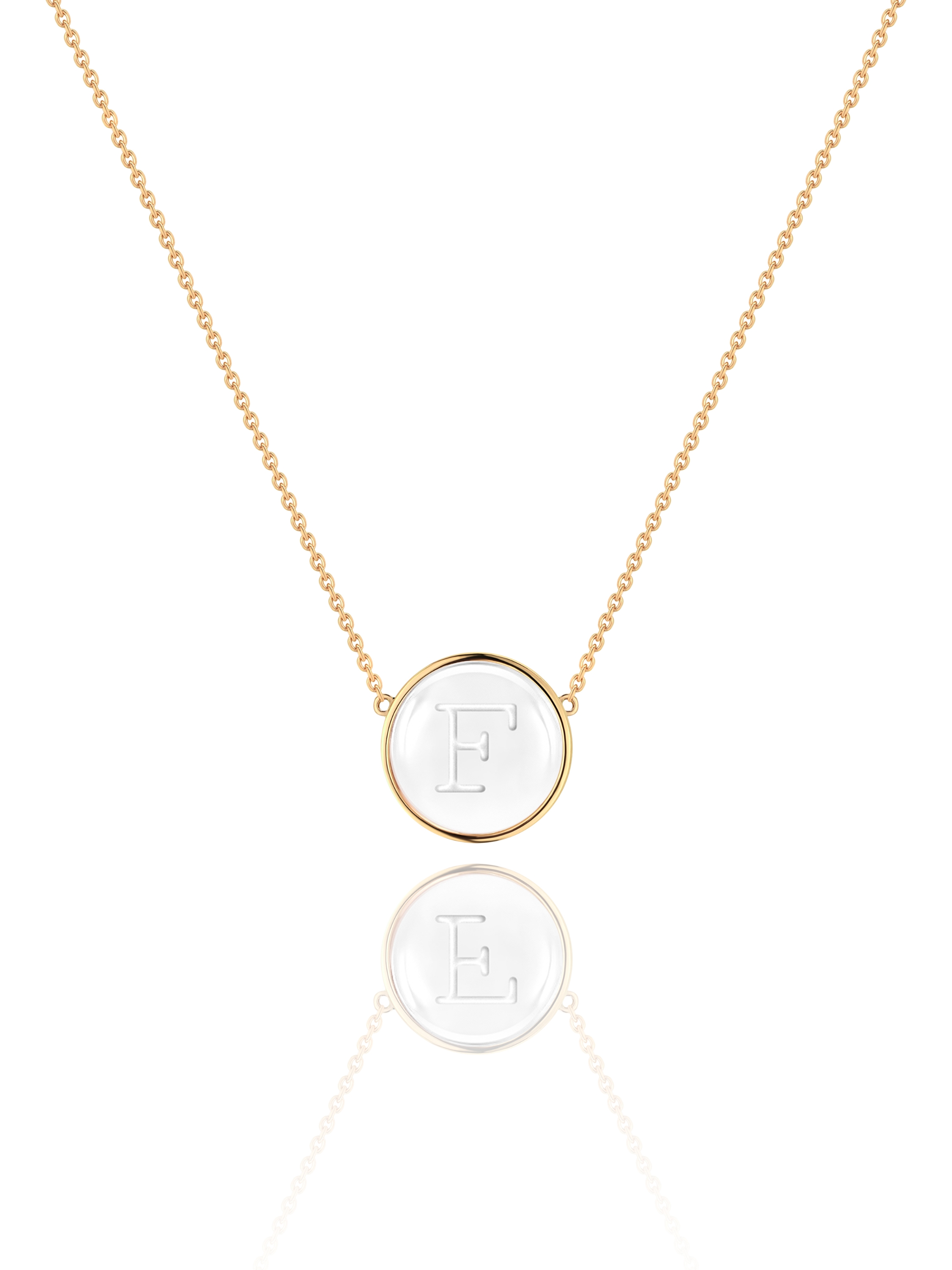 Yellow gold necklace with letter F pendant with rock crystal 6.05 ct.
