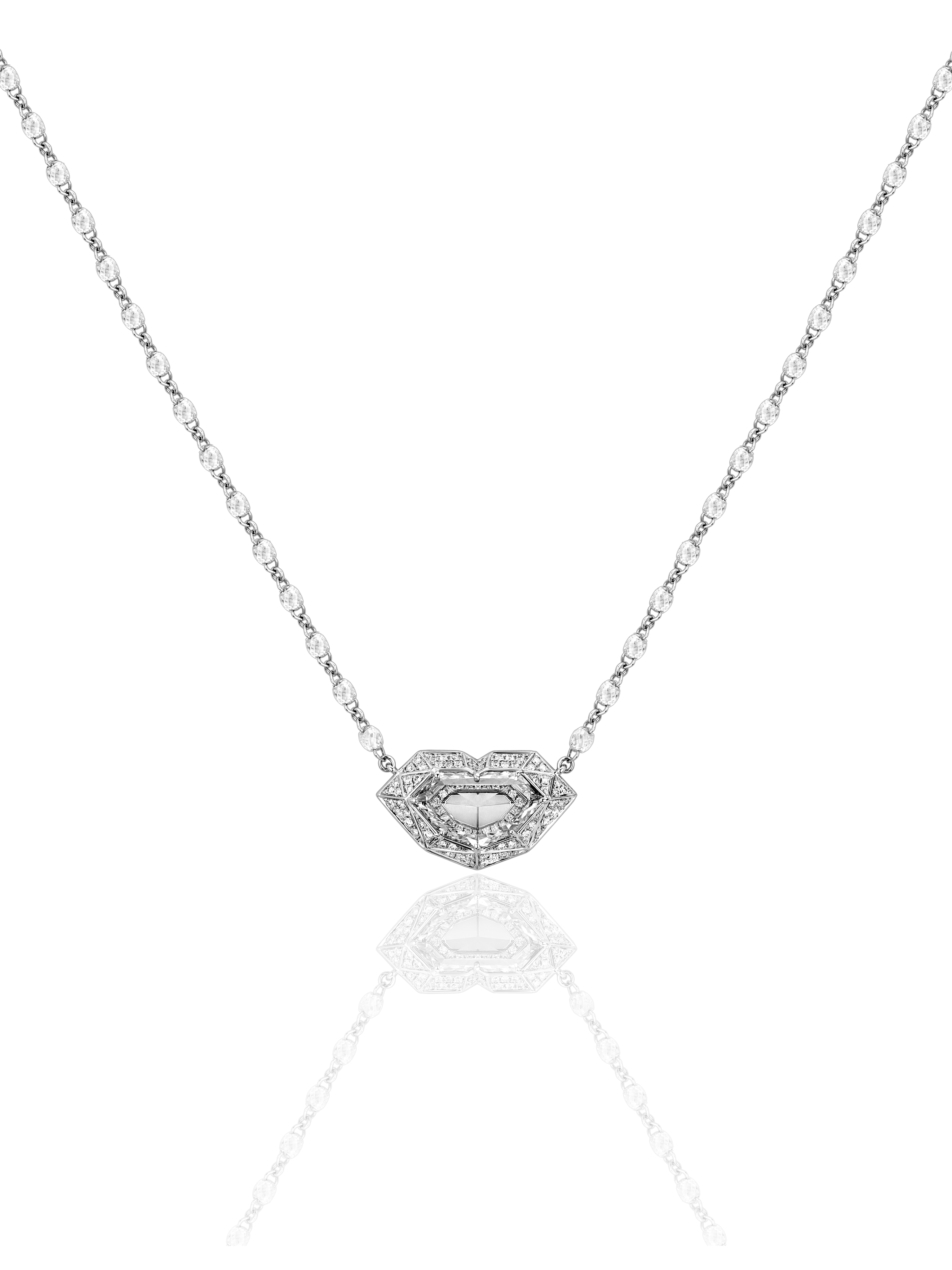 Necklace with a pendant in 750 white gold, inlaid with 1 fancy diamond 1.82 ct, 71 briolettes 8.02 ct and 142 round diamonds with a total weight of 0.46 ct.