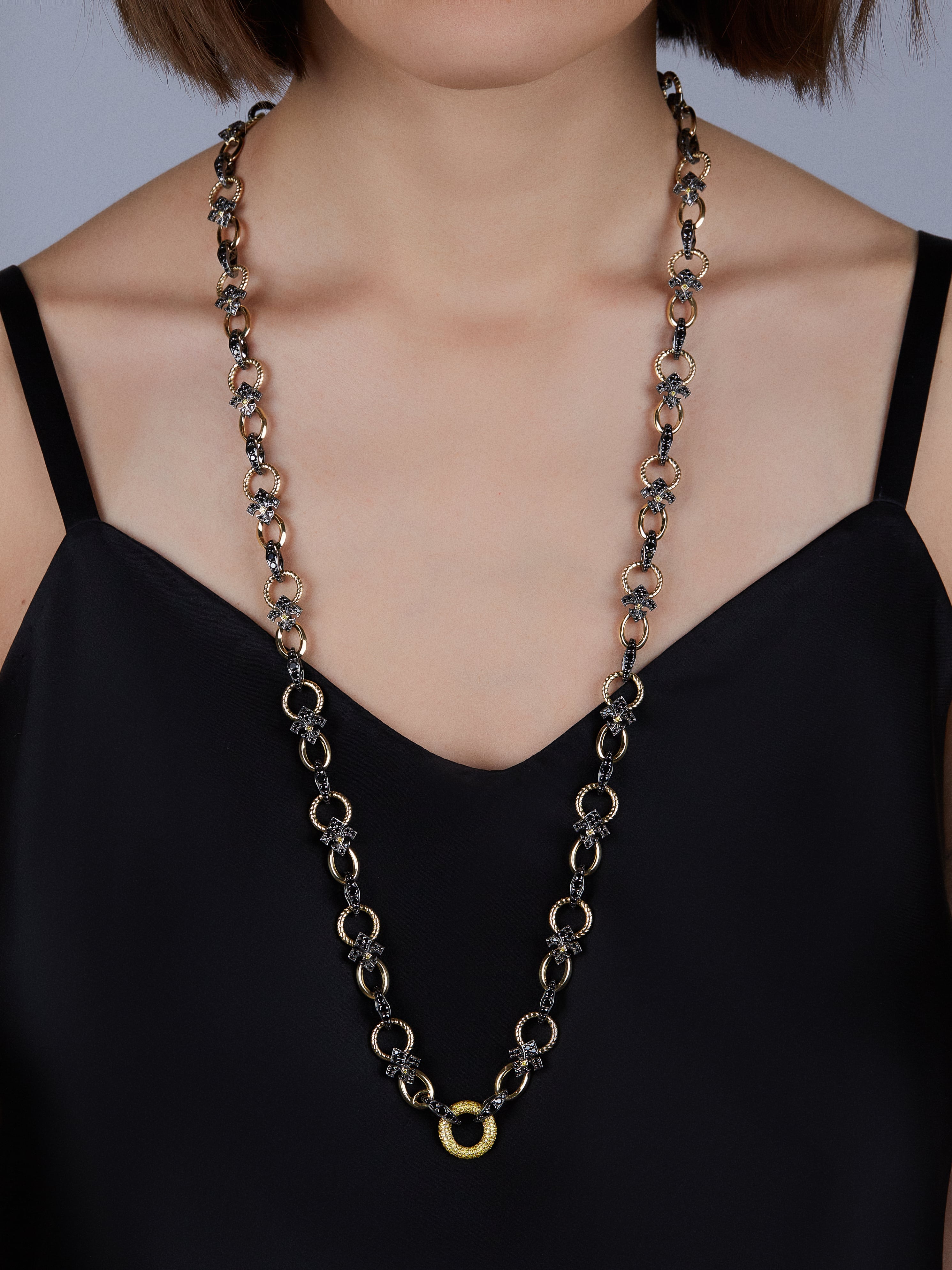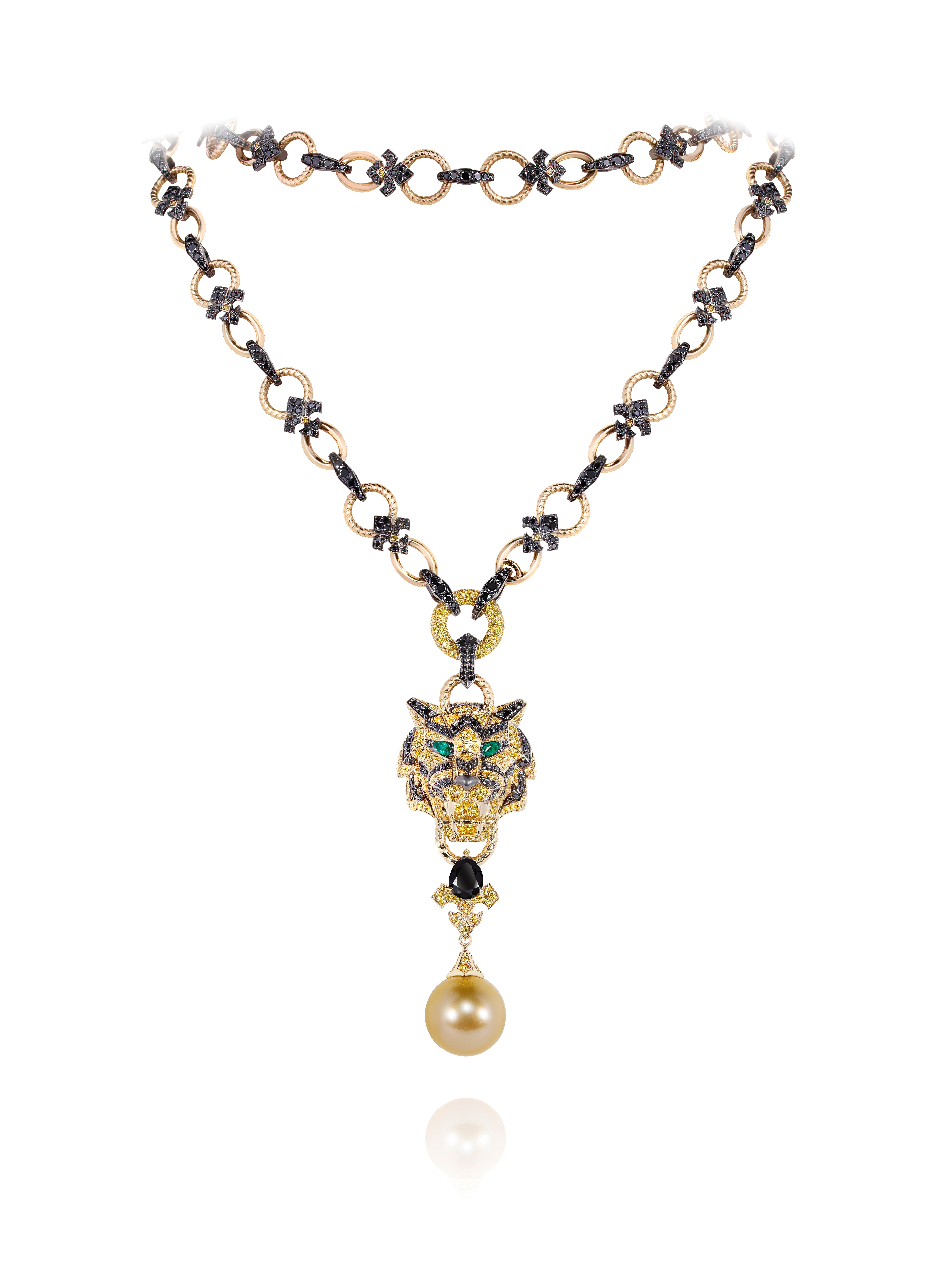 Necklace with a tiger-shaped pendant made of gold, set with 669 round-cut black diamonds with a total weight of 8.74 ct, 473 round-cut yellow diamonds with a total weight of 3.34 ct, South Sea golden pearl weighing 6.30 g and 16.3 mm in diameter, 2 marquise-cut emeralds with a total weight of 0.24 ct and a pear-cut black diamond weighing 2.16 ct.