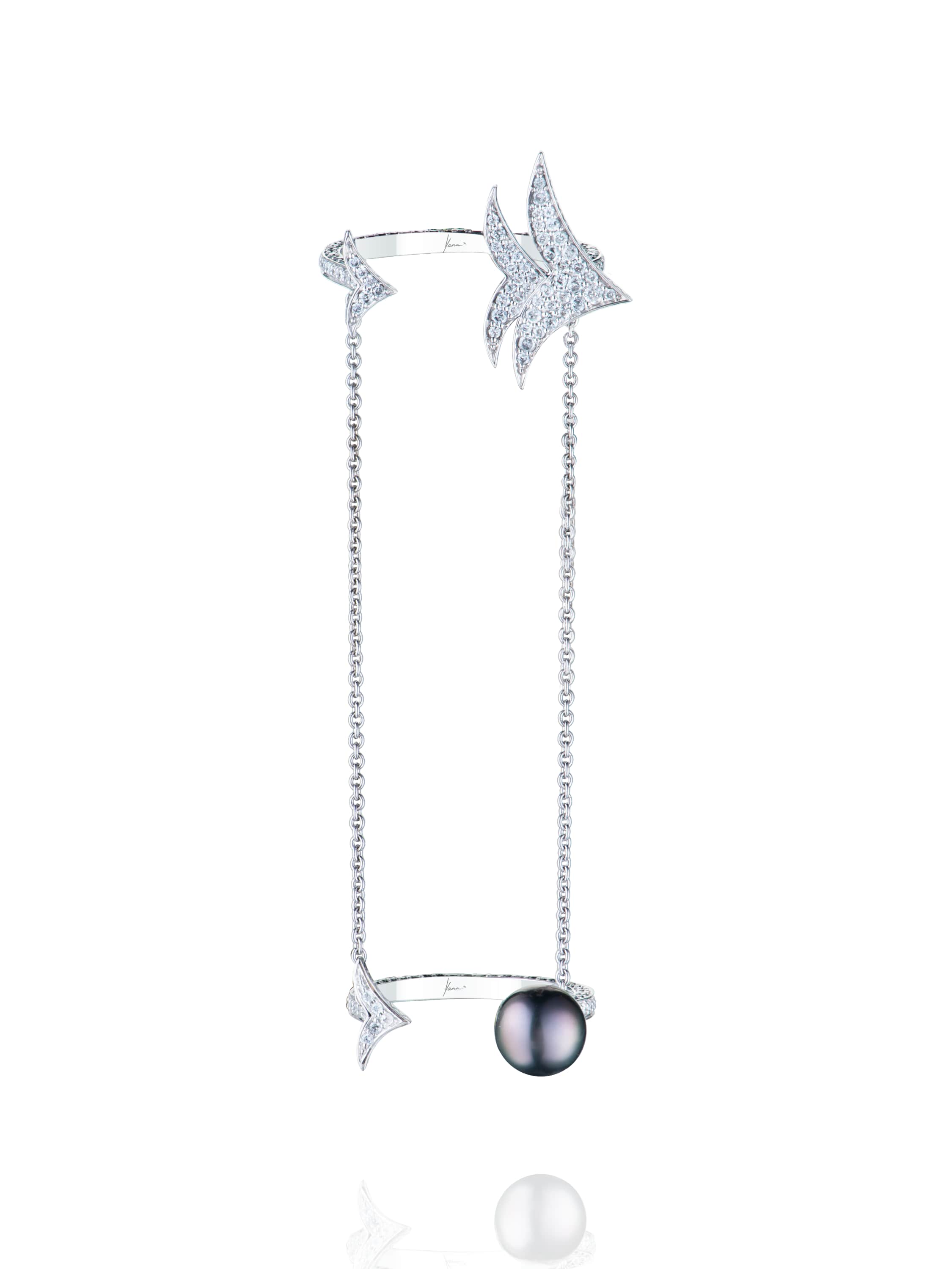 Double ring in white gold with 168 round-cut black diamonds weighing 0.45 ct, 149 round-cut grey diamonds with a total weight of 0.50 ct, and pearl weighing 0.31 g and 6.0 mm in diameter.