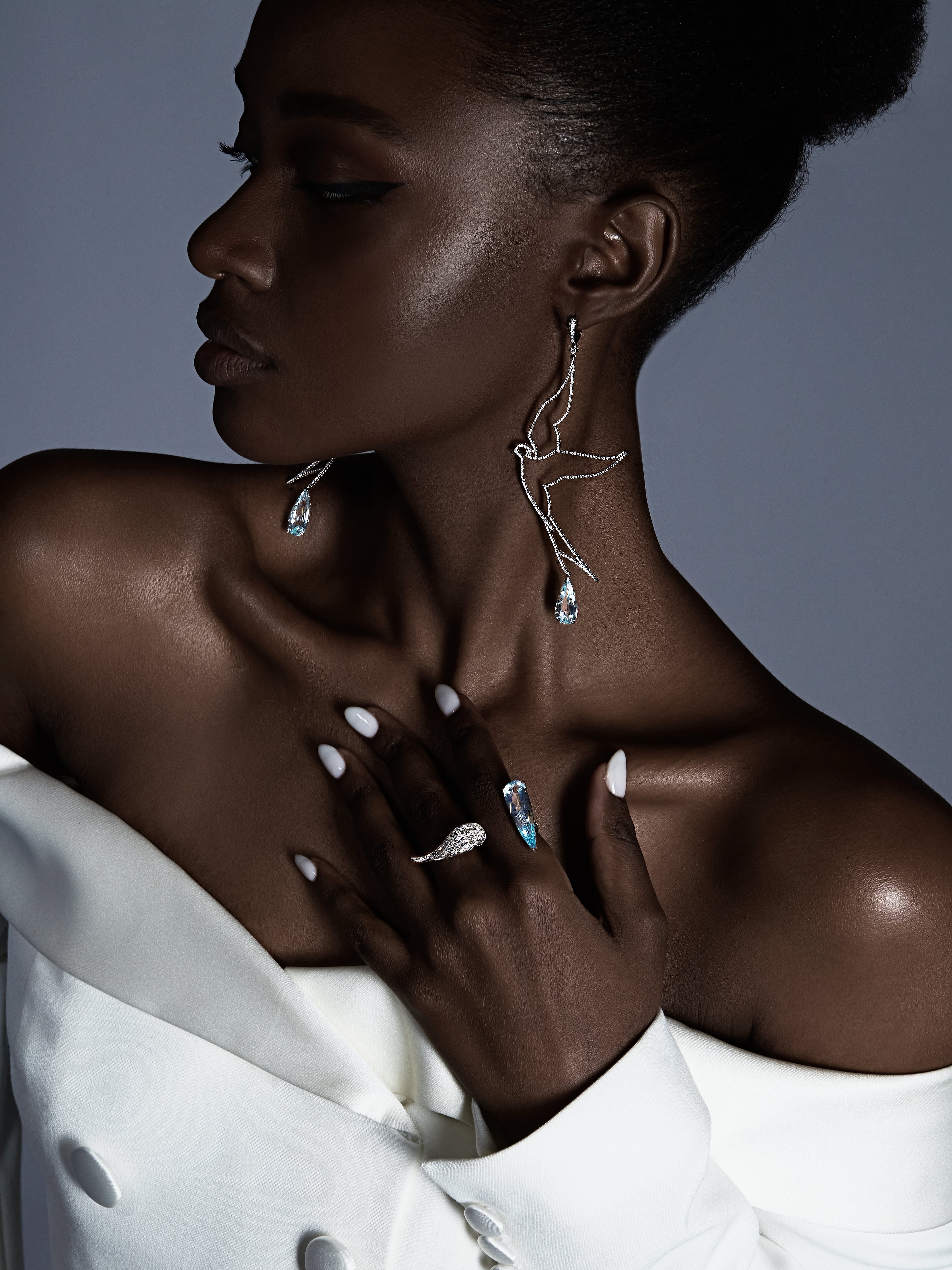 White gold ring with a pear-cut aquamarine weighing 6.87 ct and 146 round diamonds with a total weight of 1.21 ct.