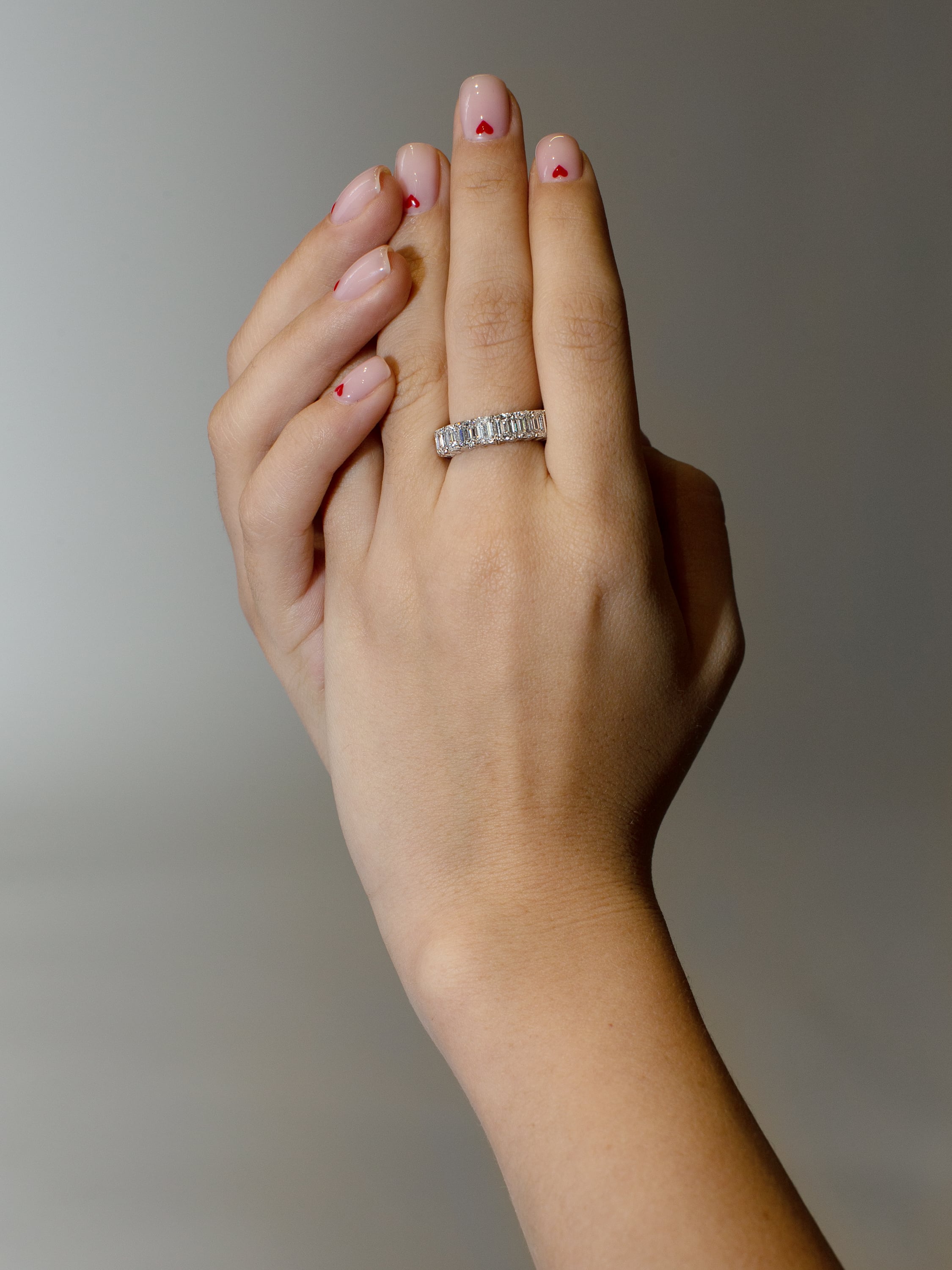 A white gold ring inlaid with 24 emerald-cut diamonds with a total weight of 3.49 ct H/SI.