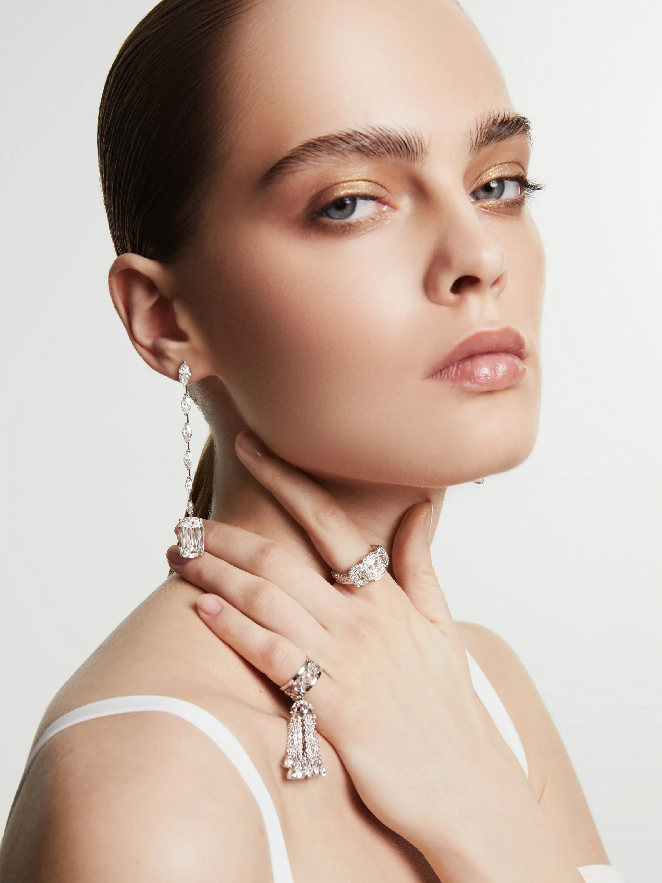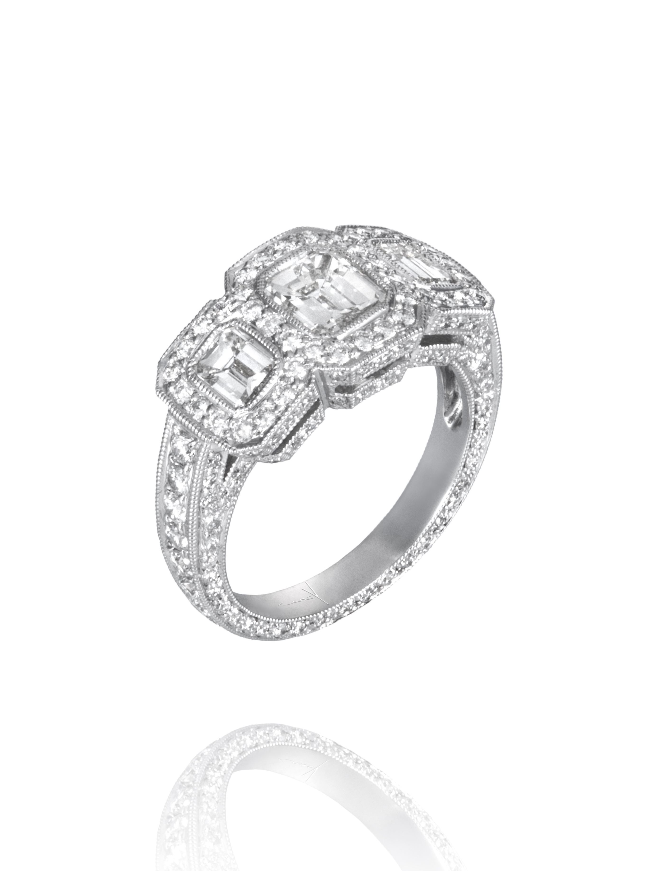 Ring made of white gold, incrusted with 185 round-cut diamonds with a total weight of 1.57 ct and 3 baguette-cut diamonds with a total weight of 2.13 ct.