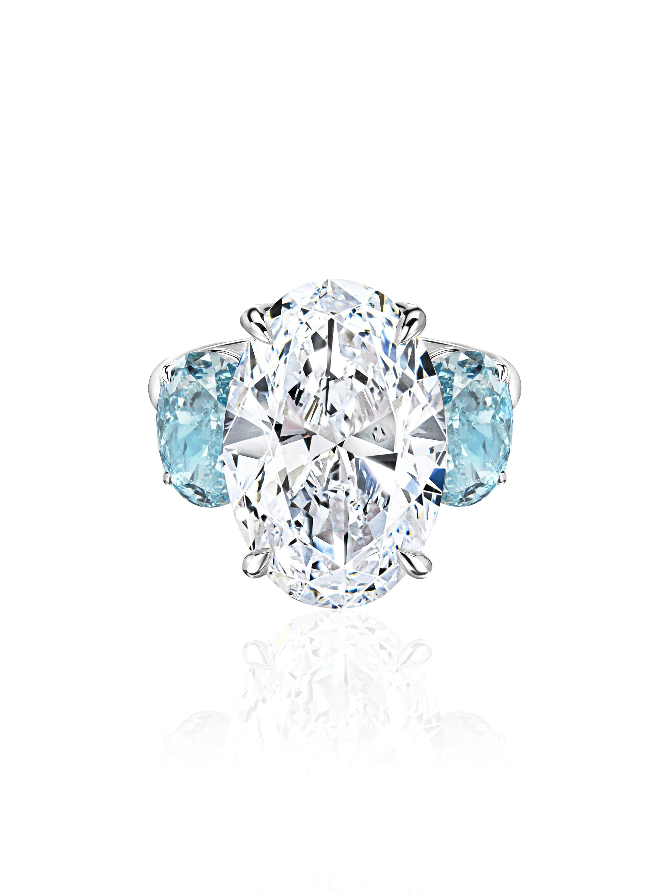 White gold ring with an LG diamond in oval cut 2.74 ct E/VS2, 2 oval LG diamonds Fancy Vivid Blue 4.16 ct VS1-VVS2 and 24 round LG diamonds weighing 0.14 ct.
