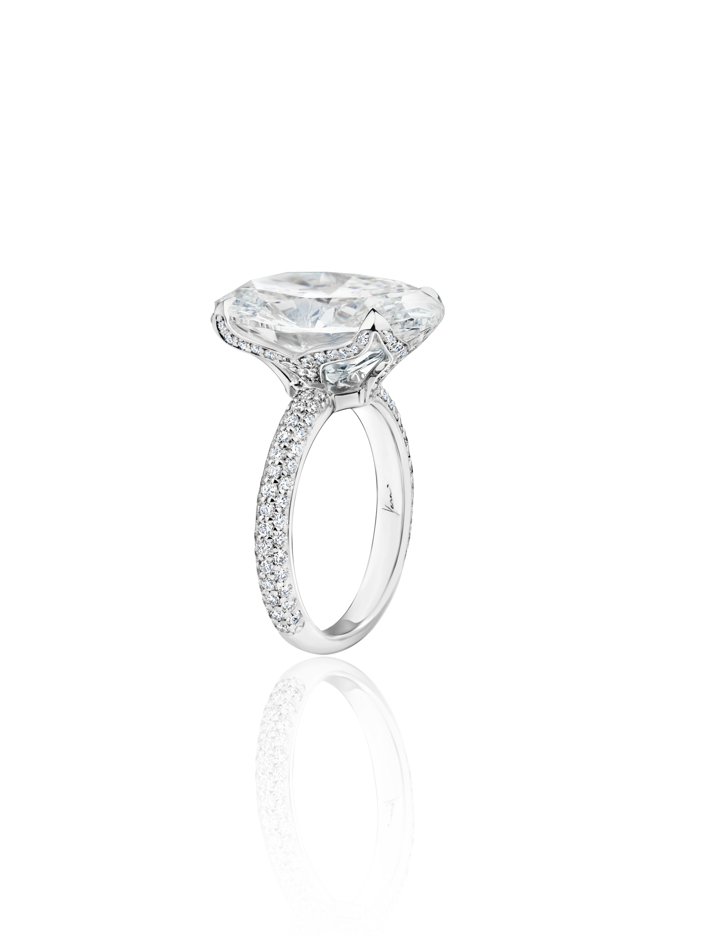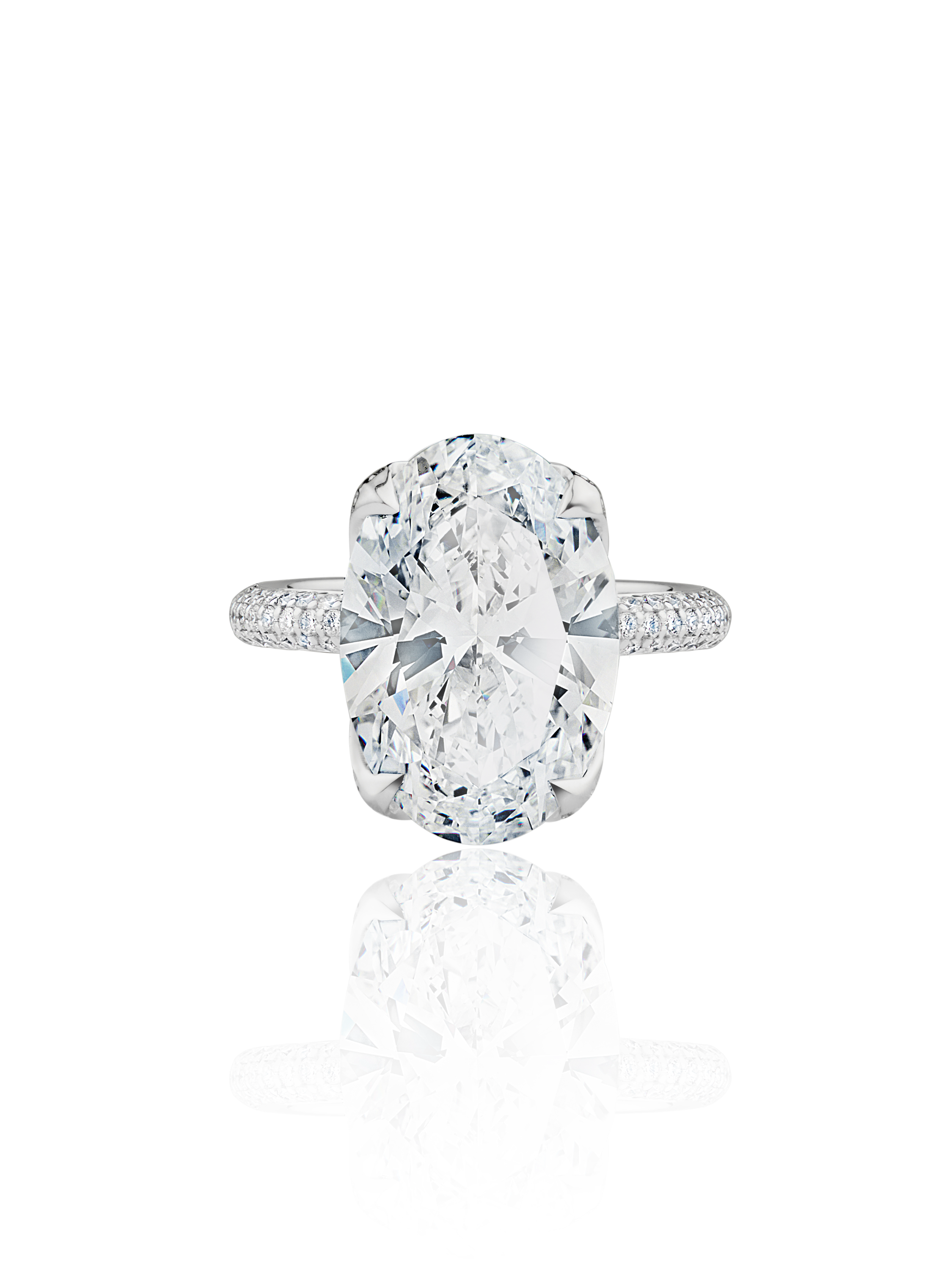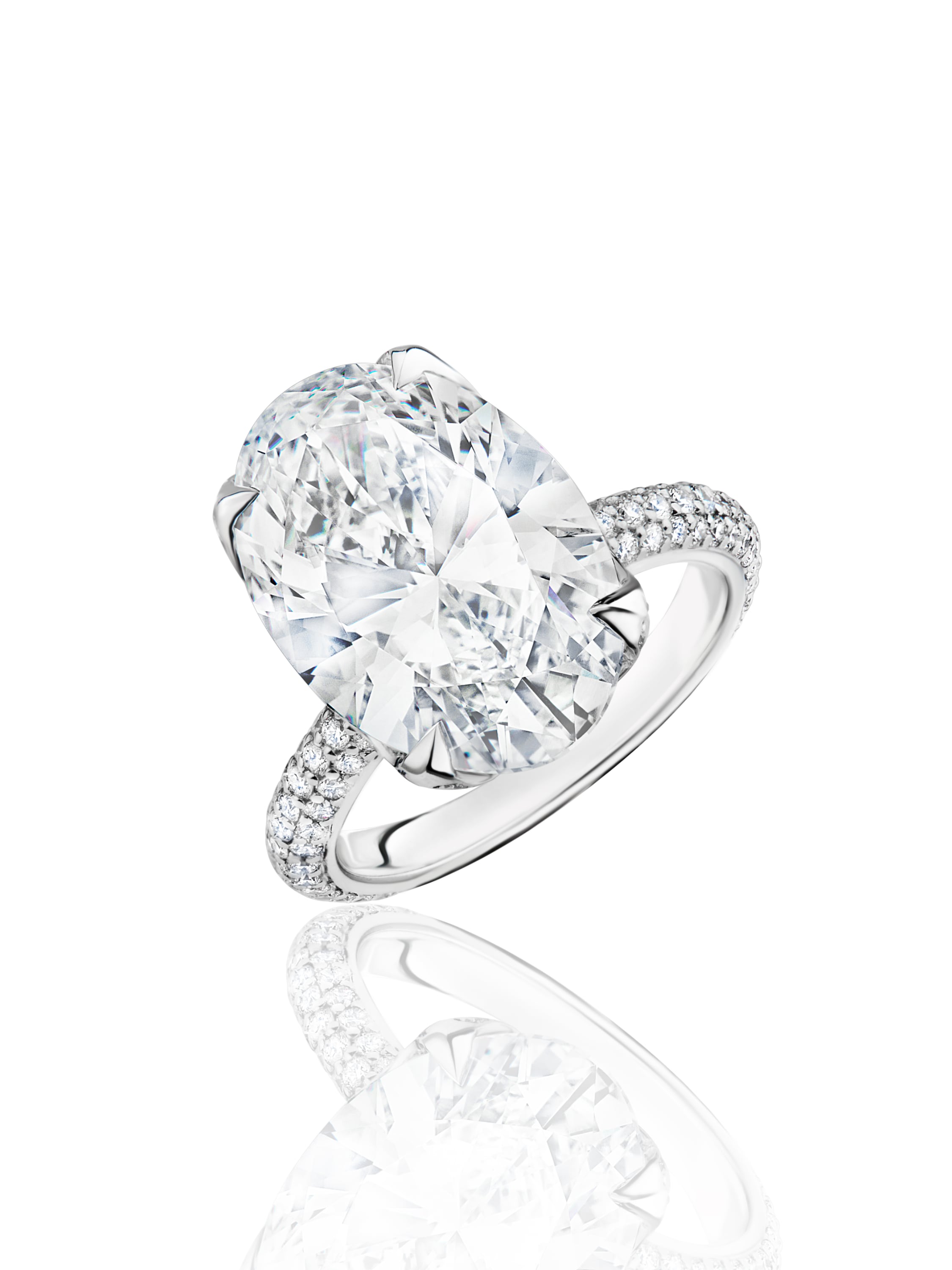 18K white gold ring with an oval-cut LG diamond 16.29 ct F/VS2 and 120 round-cut LG diamonds 1.20 ct.