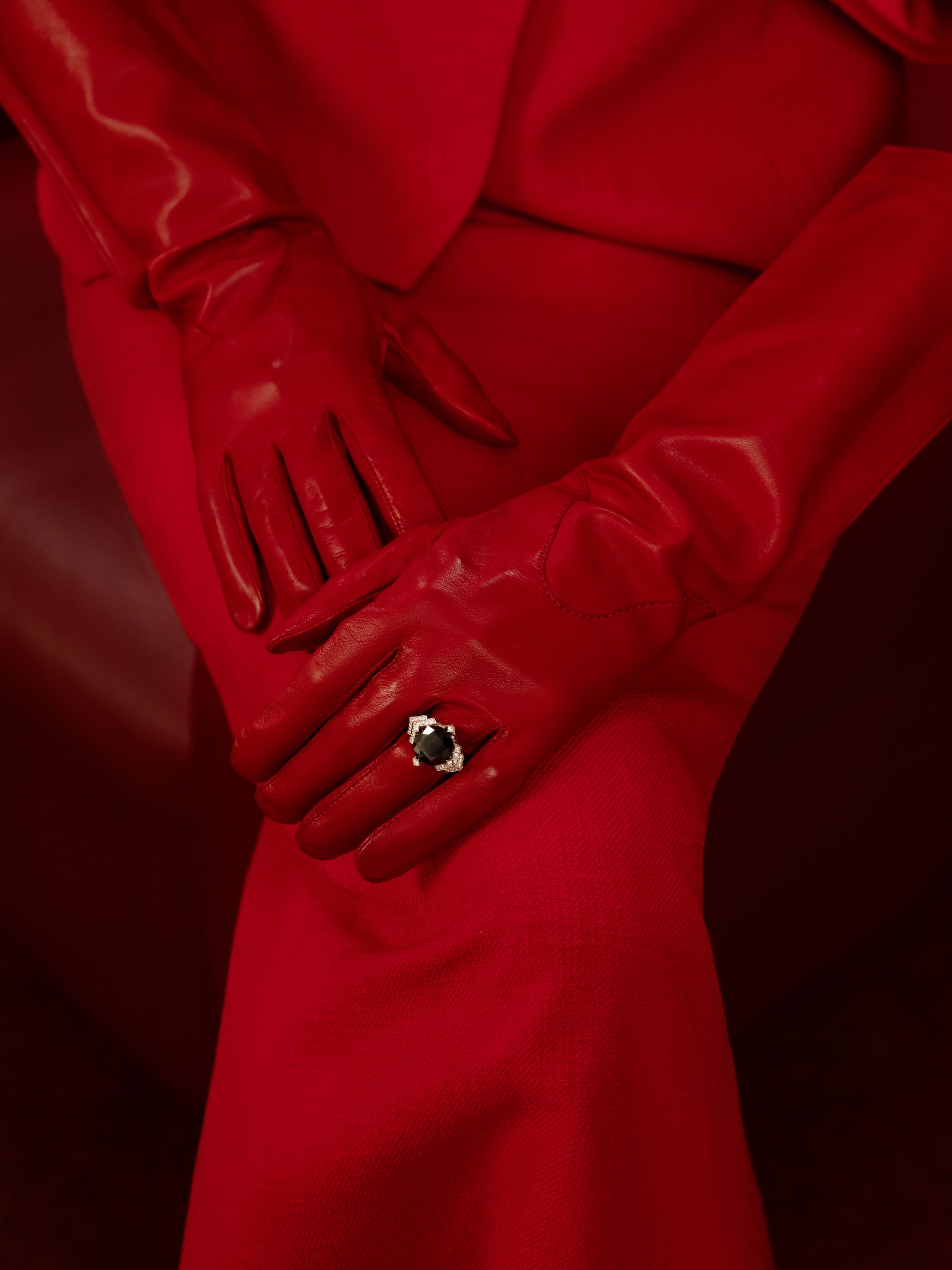 White gold ring with a round-cut black diamond weighing 11.66 ct, 3 princess-cut diamonds weighing 0.35 ct and 390 round-cut diamonds weighing 2.42 ct.