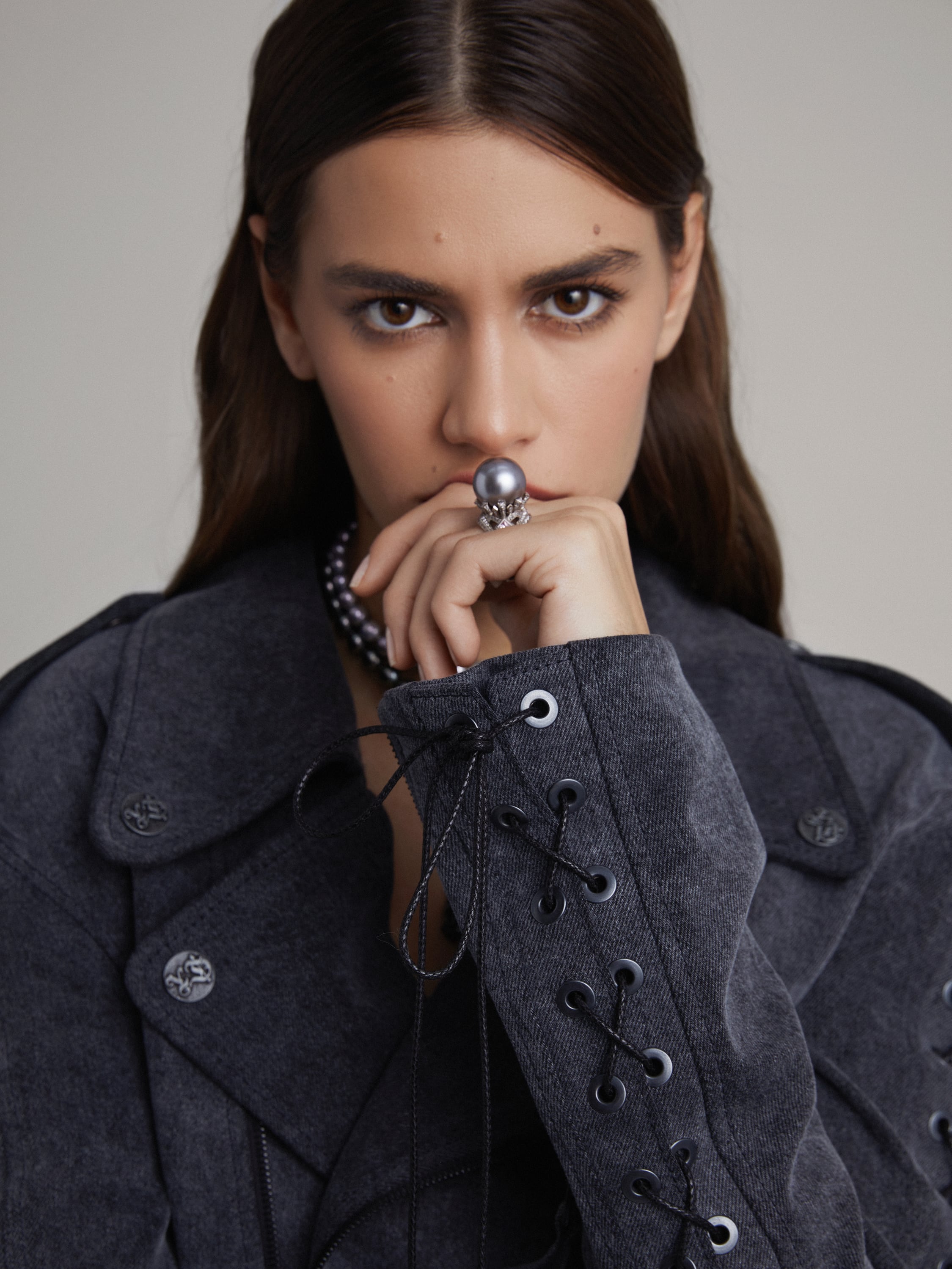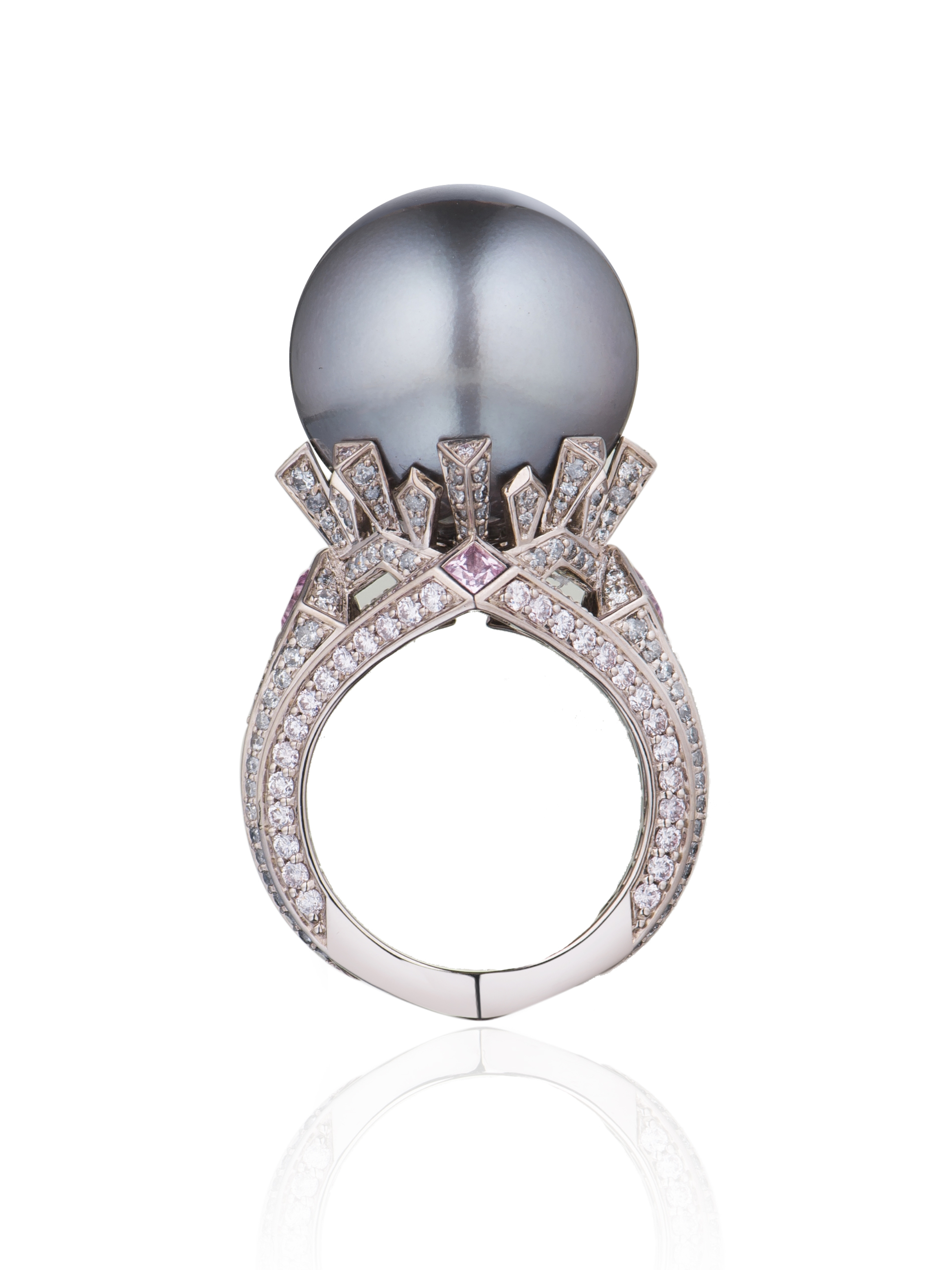White gold ring with a black pearl weighing 8.06 g with a diameter of 17.7 mm, 80 pink diamonds with a total weight of 0.78 ct, 172 grey diamonds with a total weight of 1 ct and 5 princess-cut spinels with a total weight of 0.69 ct.