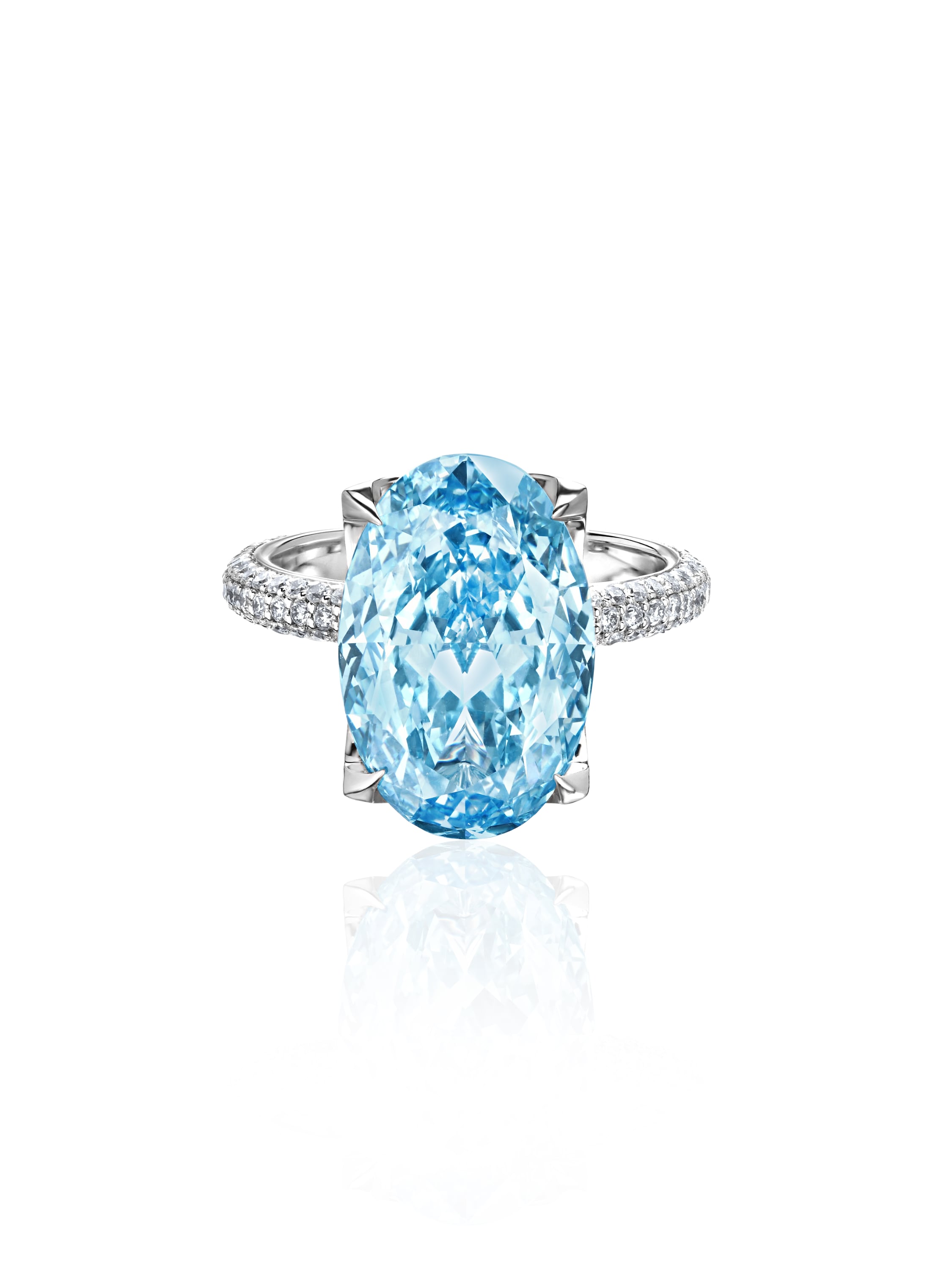 White gold ring with an oval-cut blue LG diamond 10.02 ct FVB/VS1 and 116 round LG diamonds 1.05 ct.