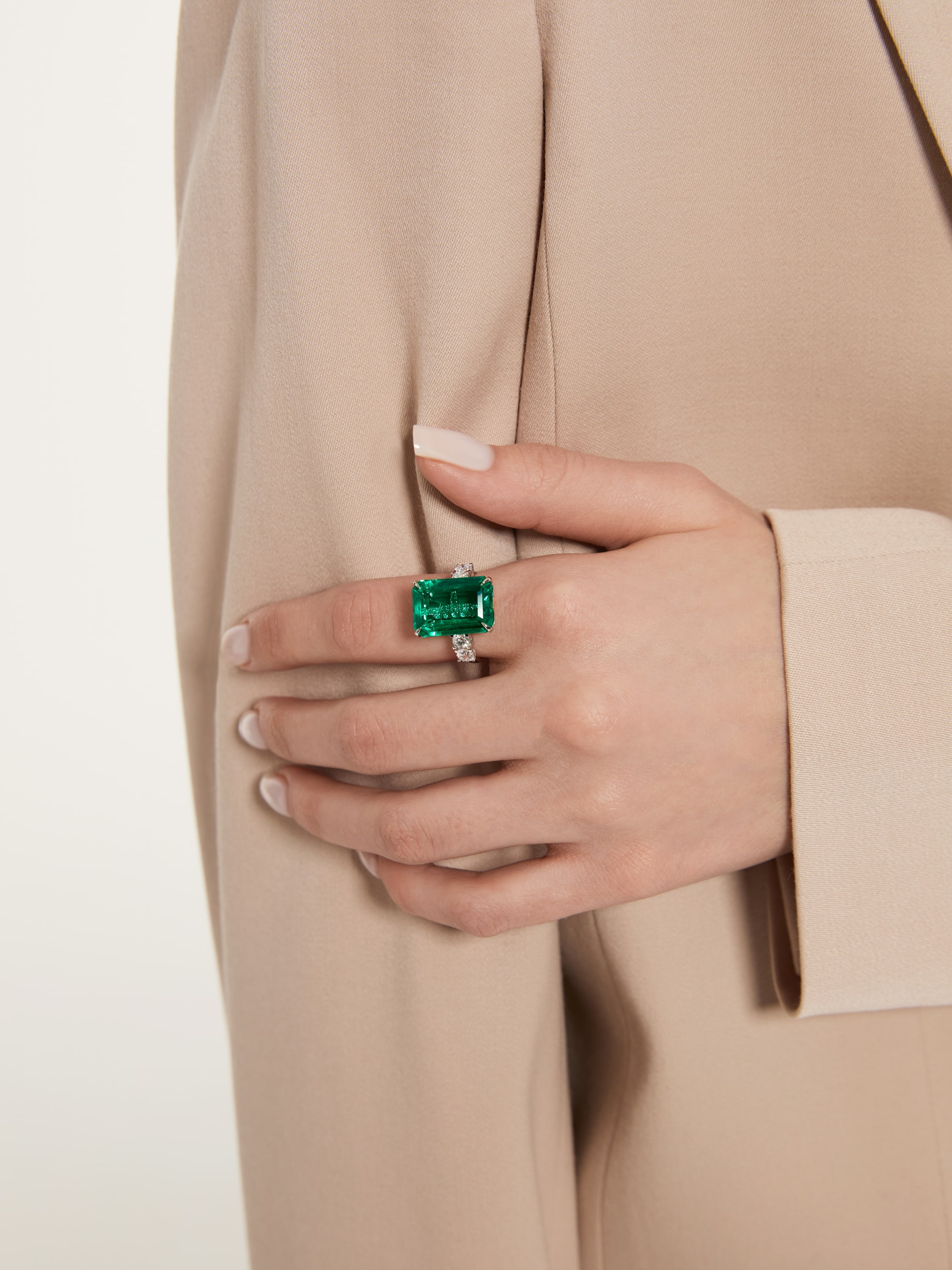 White gold ring with 1 recrystallized octagon-cut emerald weighing 10.52 ct and 12 round LG diamonds weighing 0.80 ct.