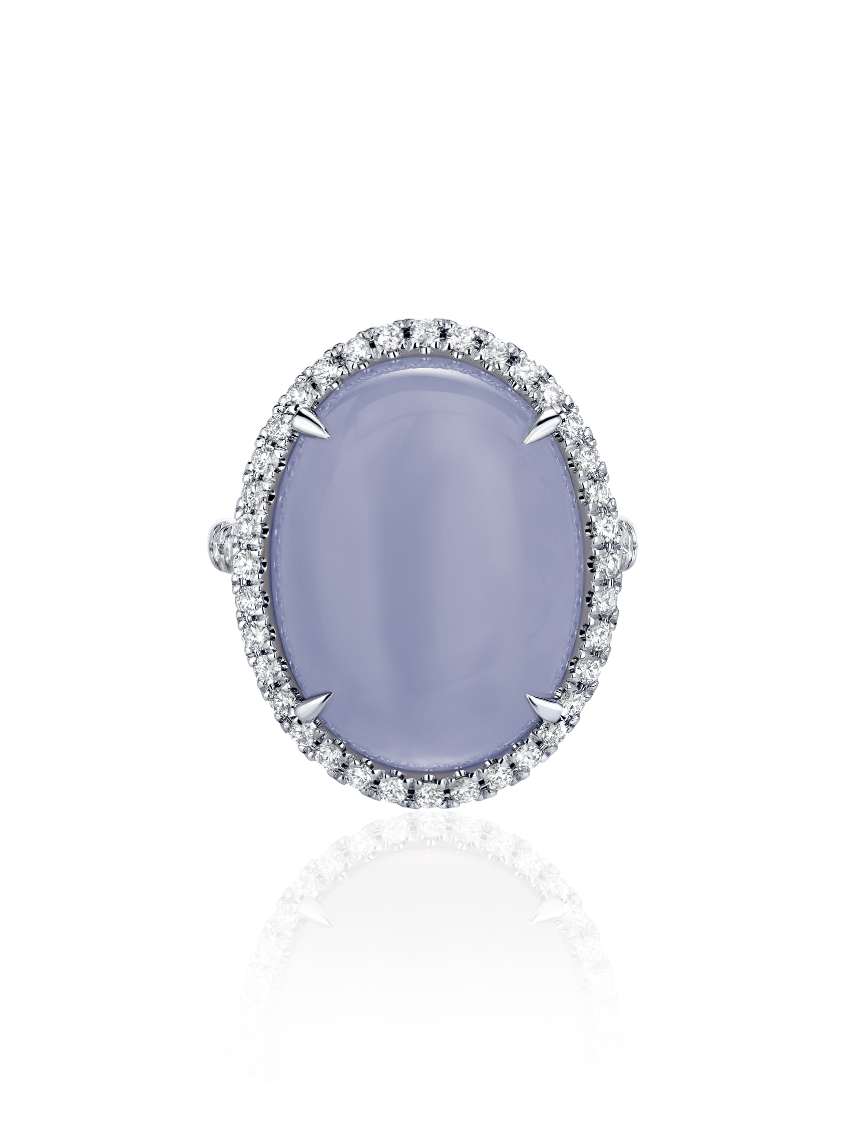 A white gold ring set with an oval chalcedony weighing 13.18 ct and 48 round diamonds with a total weight of 0.67 ct.
