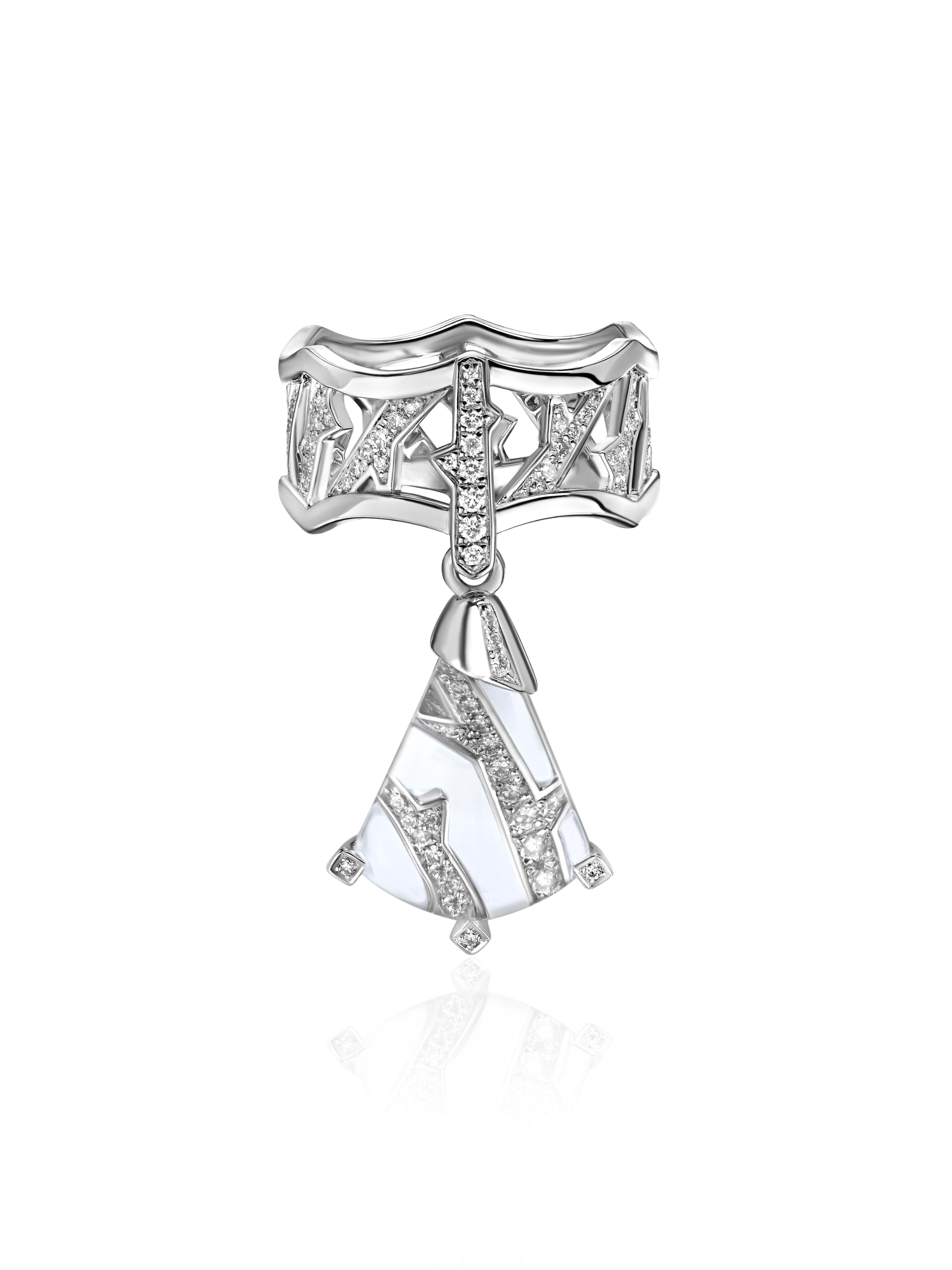 White 585 gold ring with rock crystal weighing 4.33 ct and 107 round diamonds weighing 0.46 ct.