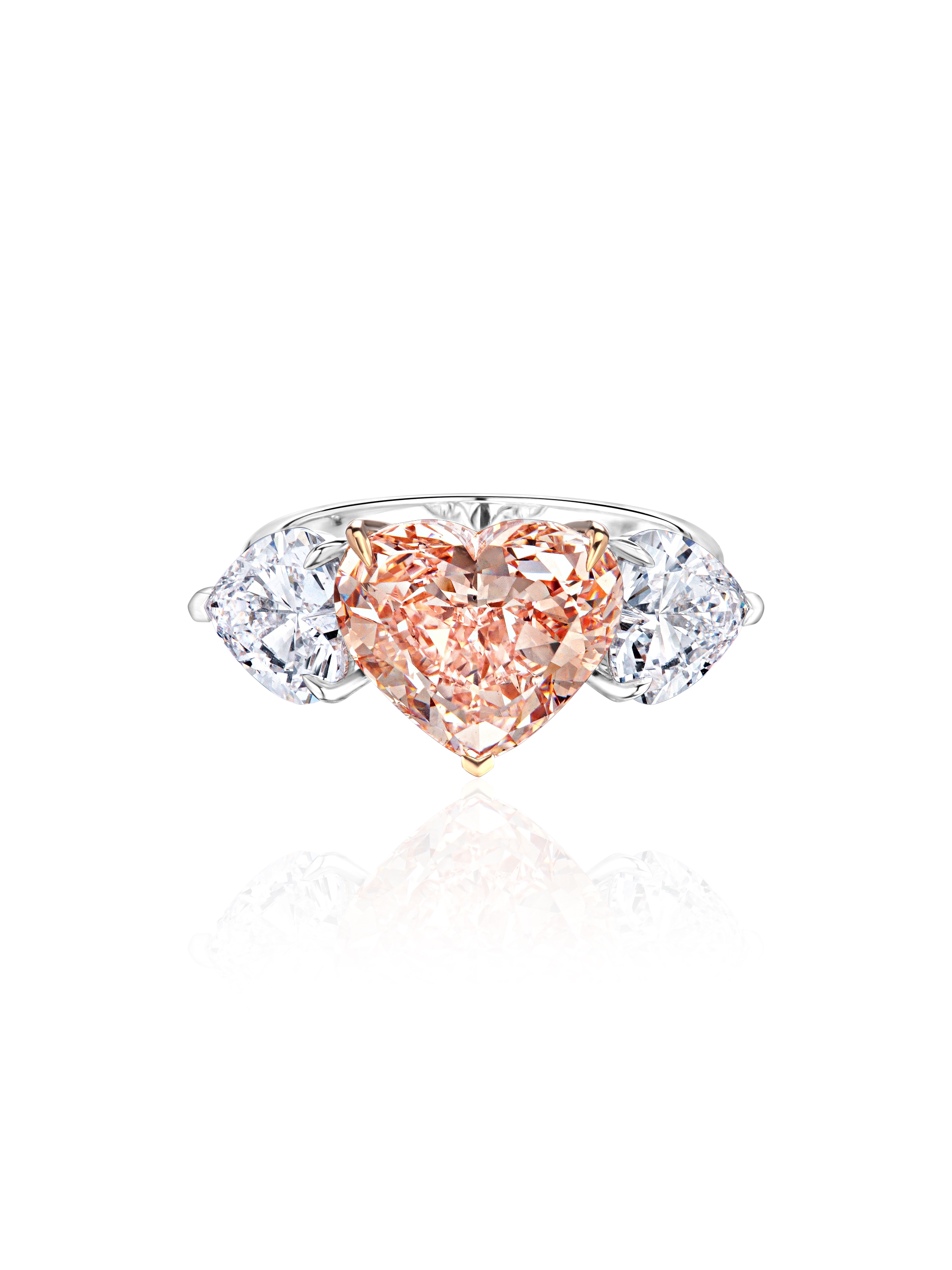 White gold ring with a pink LG diamond in a heart cut 5.02 ct FIP/SI1, with 2 LG diamonds in a heart cut 2.12 ct D/VS1.