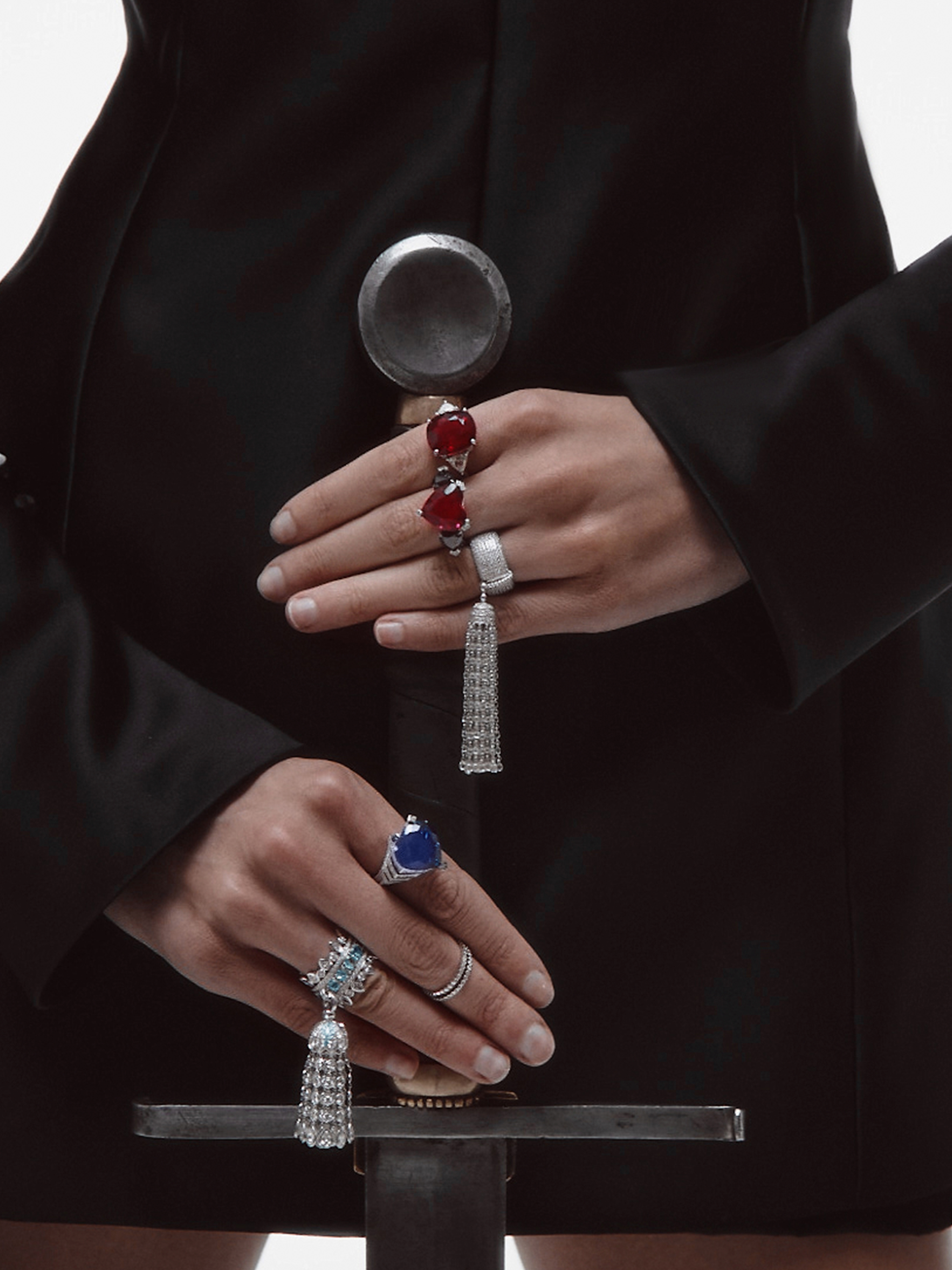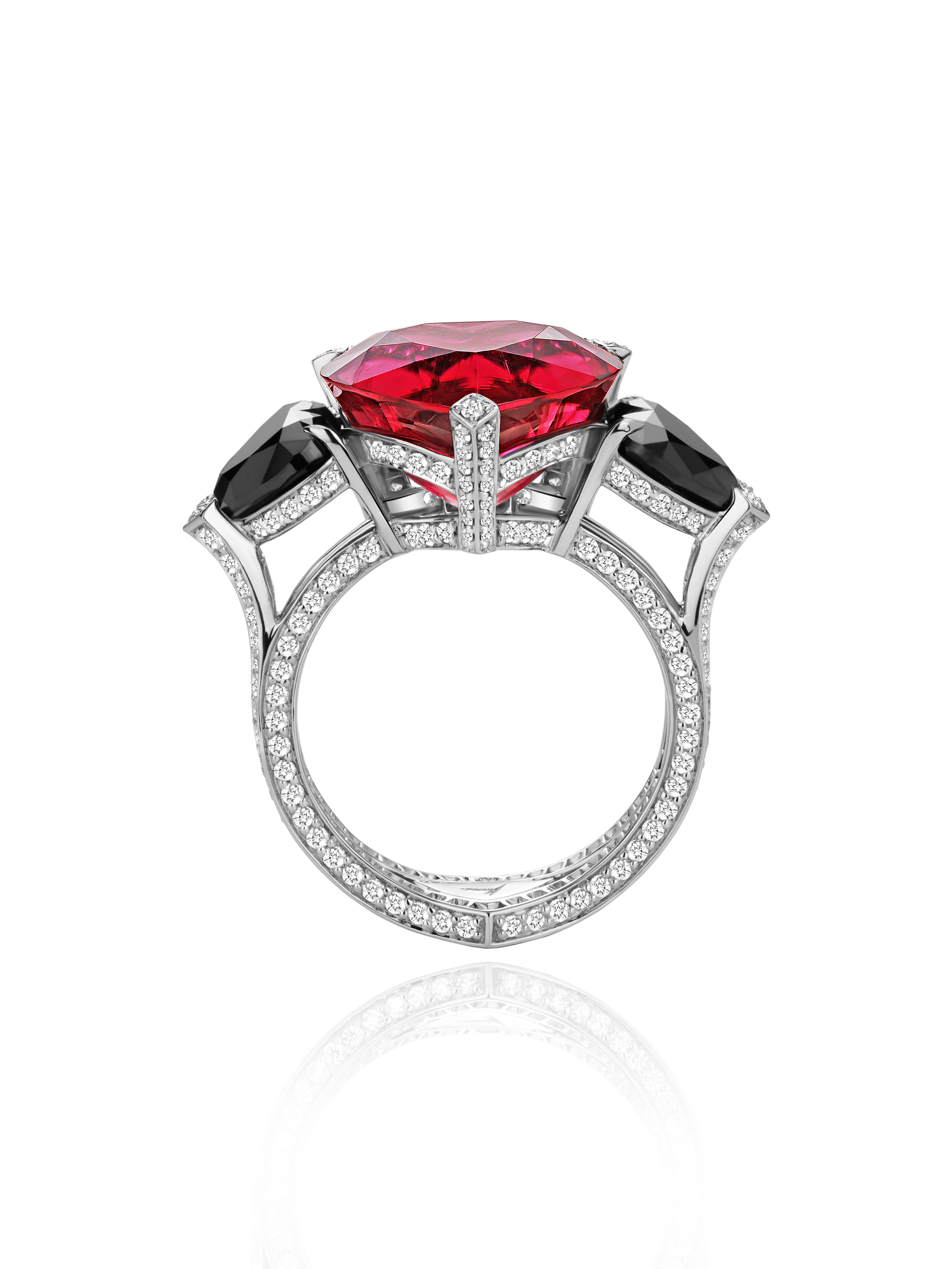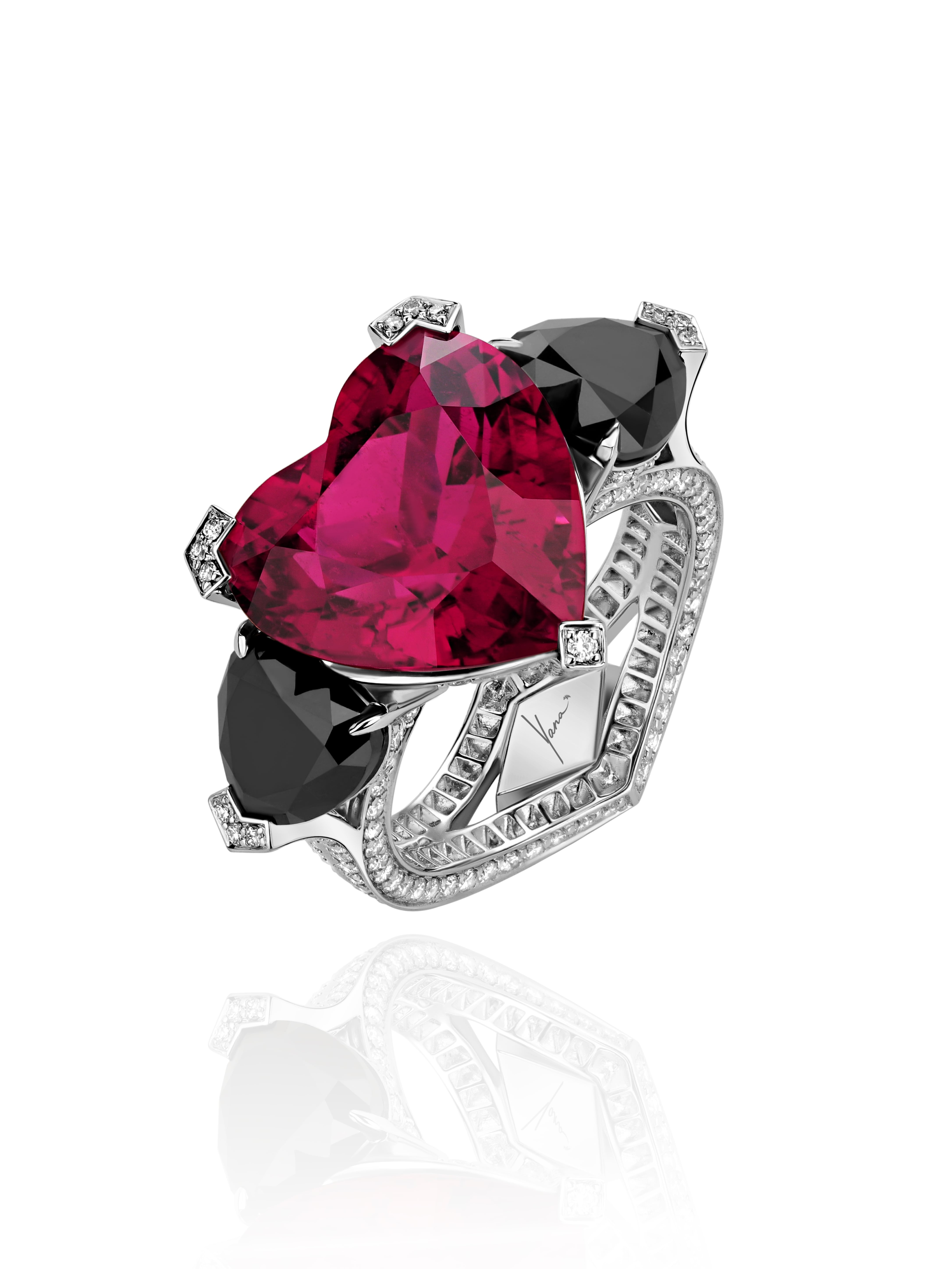 White gold ring with a heart-cut rubellite weighing 9.35 ct, 2 heart-cut black diamonds with a total weight of 3.16 ct, and 279 round-cut diamonds with a total weight of 1.40 ct.