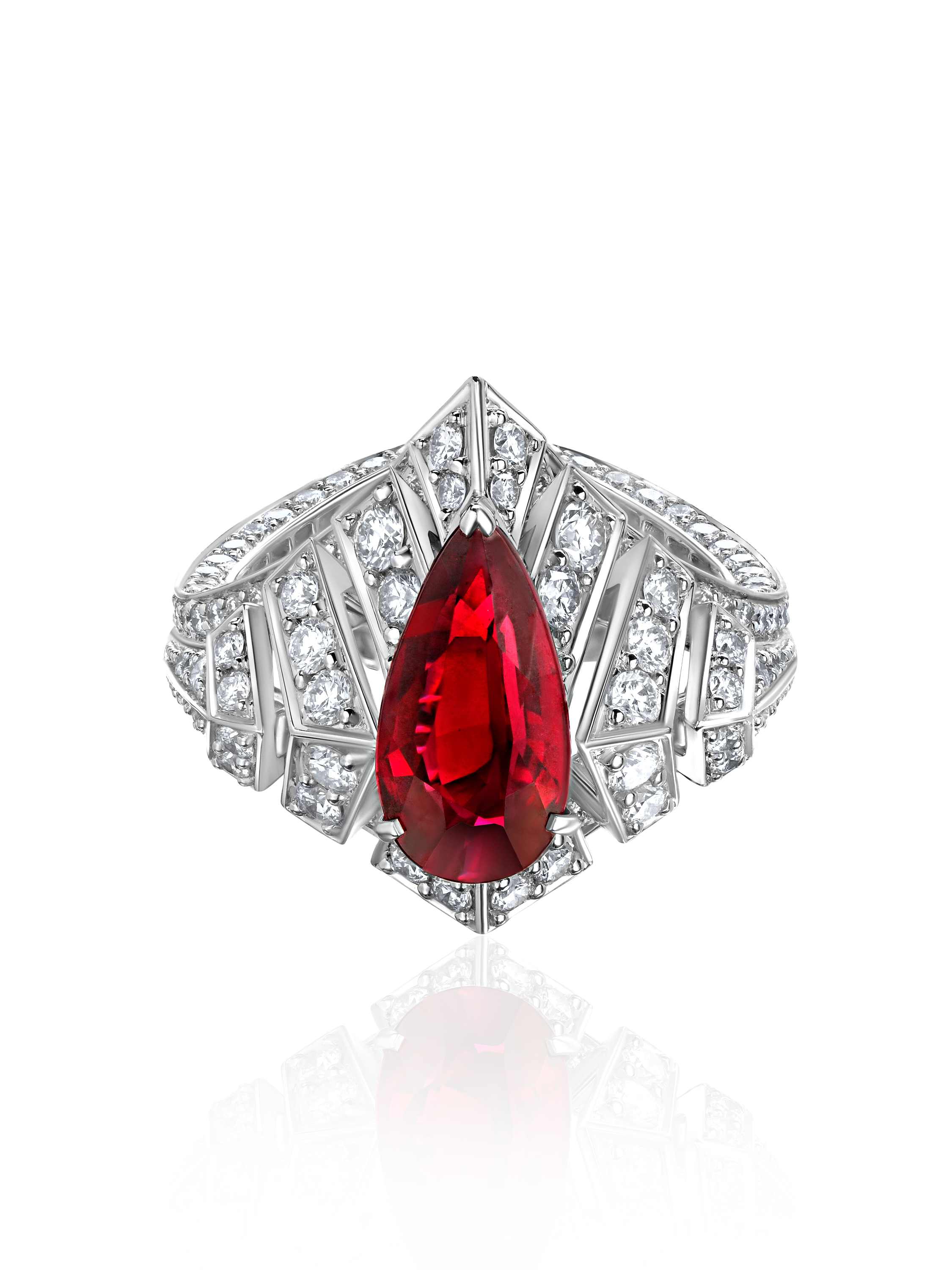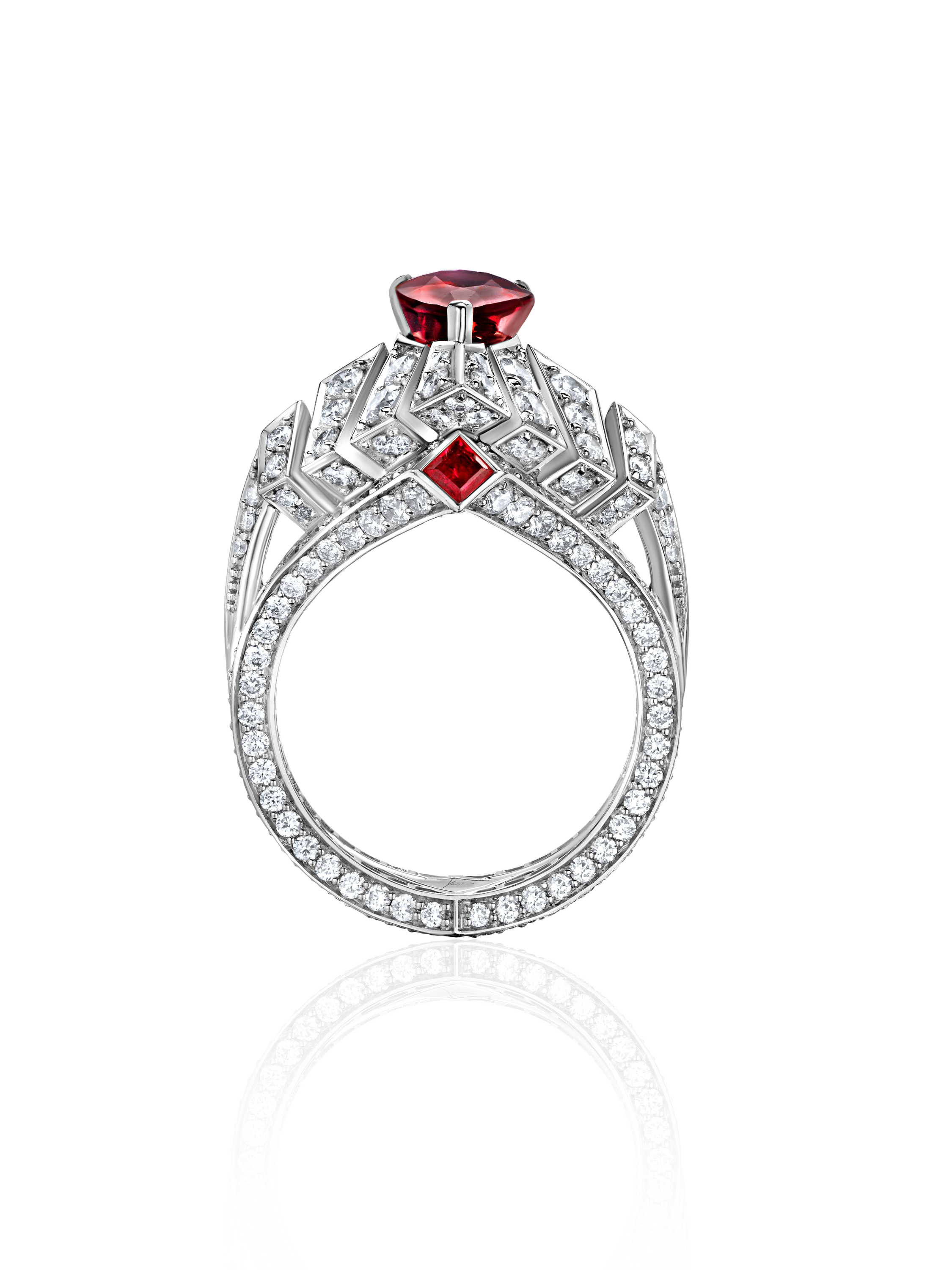 Ring made of white gold, inlaid with a Pigeon Blood pear-cut ruby weighing 3.03 ct, 3 princess-cut rubies weighing 0.35 ct, and 283 round-cut diamonds with a total weight of 2.49 ct.
