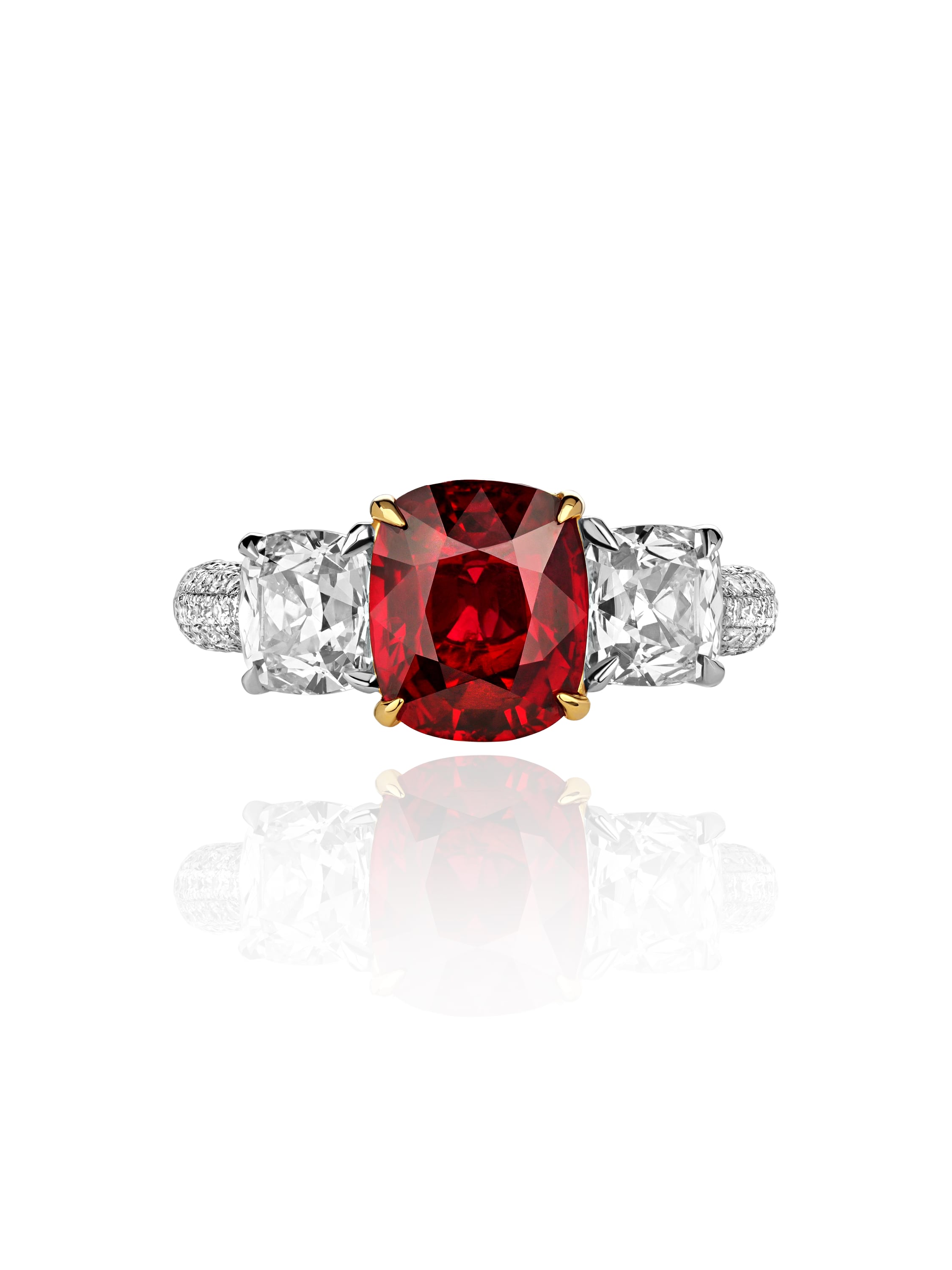 White gold ring with 1 cushion-cut ruby and diamonds weighing 3.02 ct, 1 cushion-cut diamond 0.80 ct E/VS2, and 180 round diamonds weighing 0.57 ct.