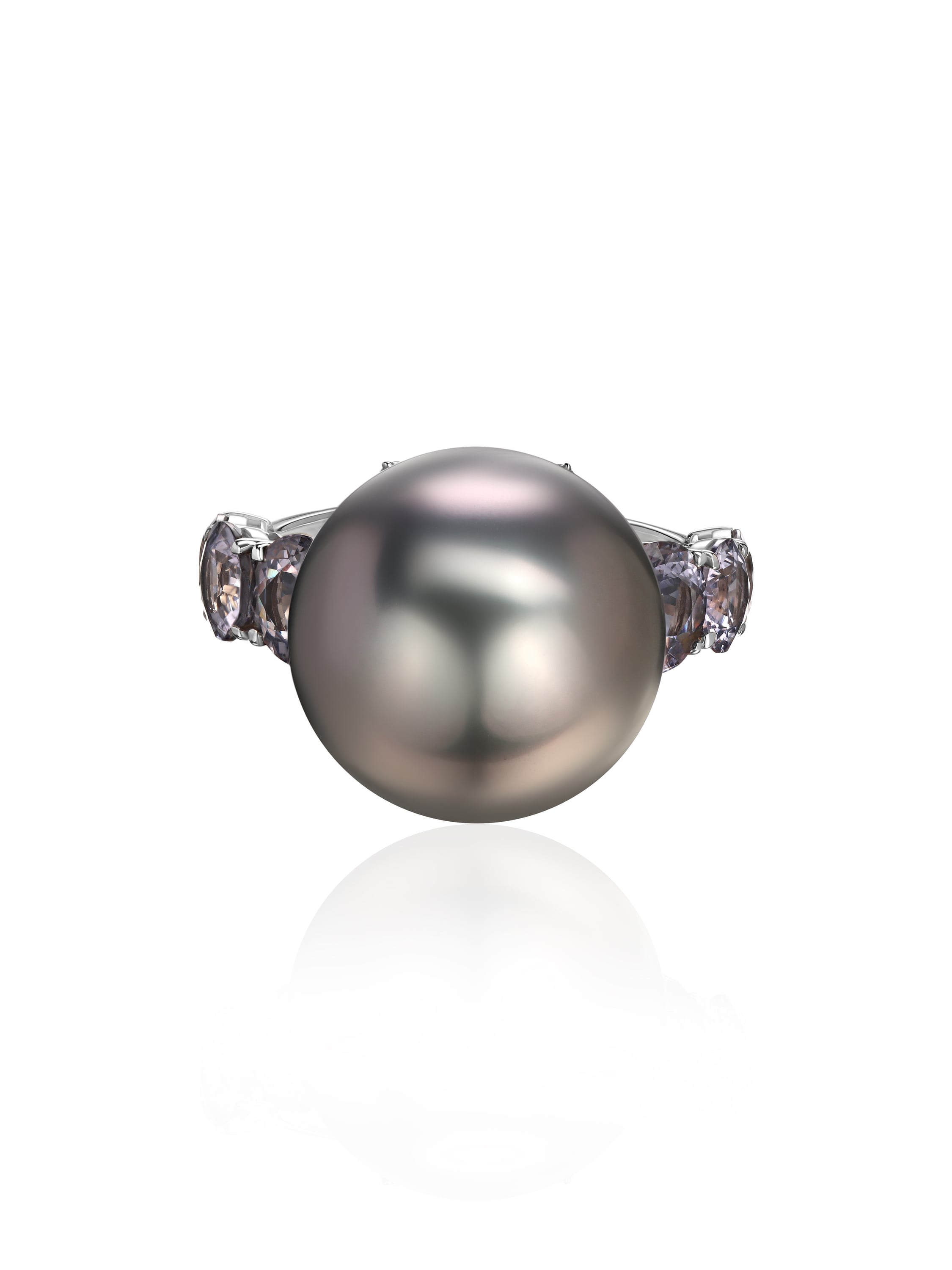 White gold ring with gray Tahitian pearl and spinel