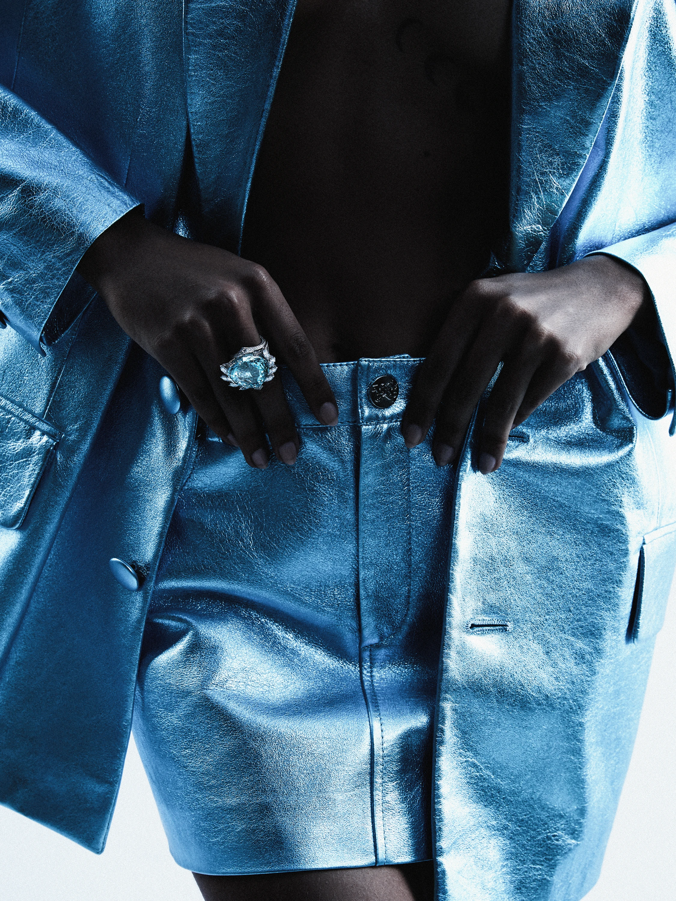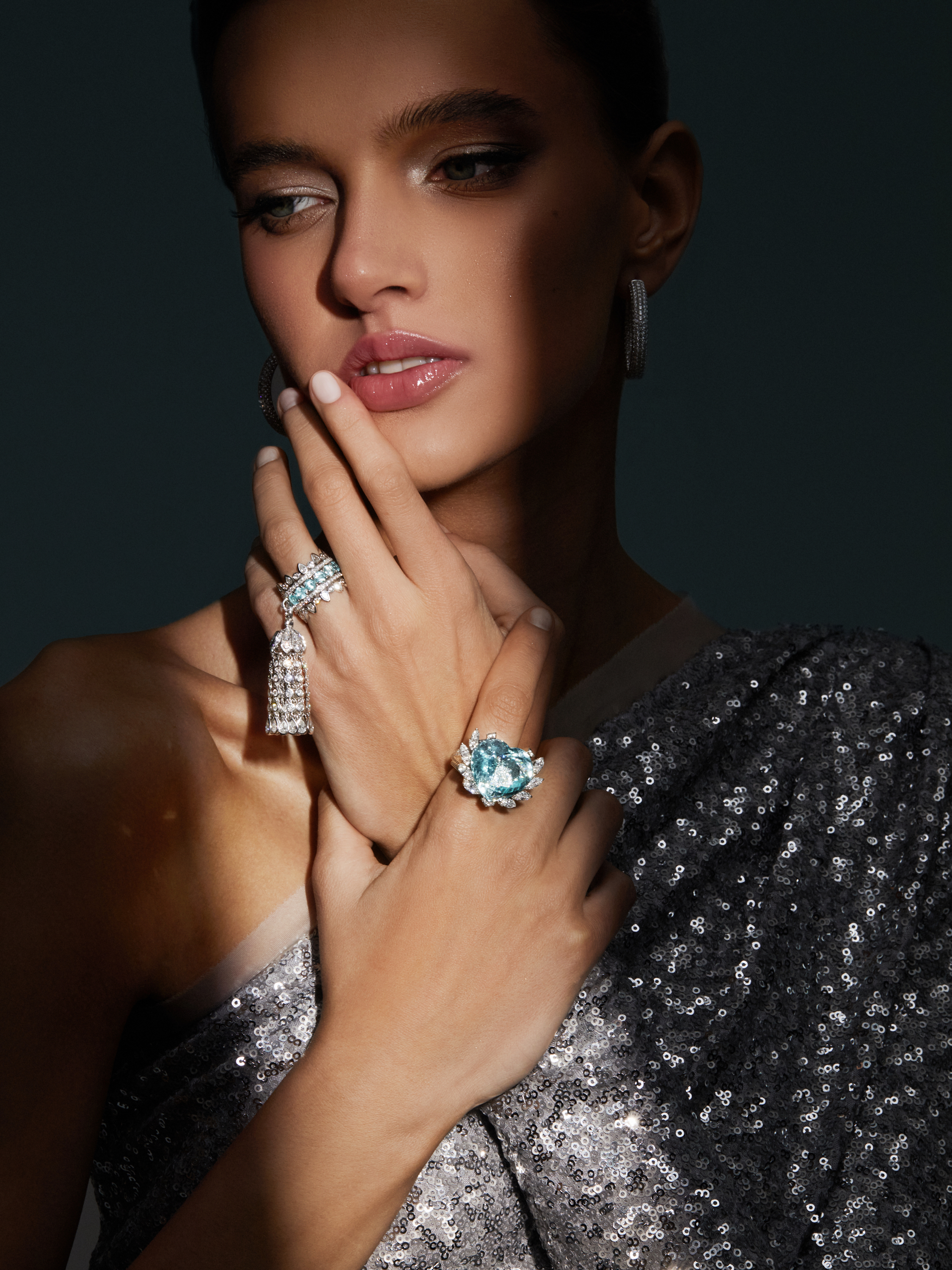 White gold ring with a heart-cut Paraiba tourmaline weighing 19.14 ct, 8 marquise-cut diamonds with a total weight of 1.55 ct, 3 princess-cut diamonds with a total weight of 0.28 ct and 635 round-cut diamonds with a total weight of 3.43 ct.