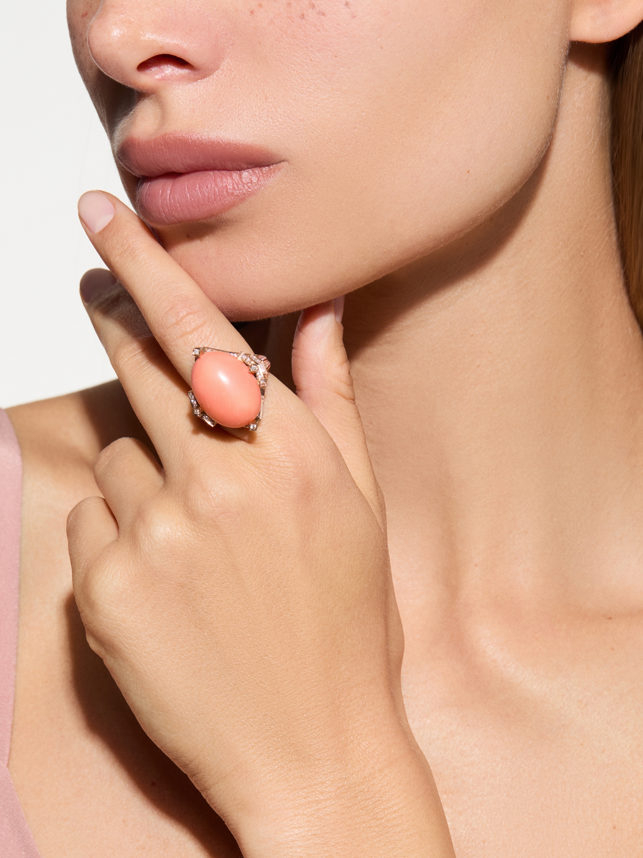Rose gold ring with an oval coral of 3.04 g, 3 princess-cut diamonds, 402 round diamonds of 1.80 ct.